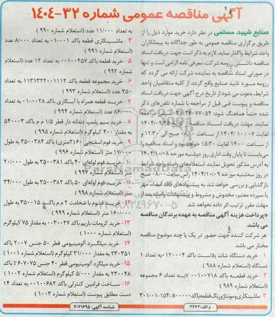 صنایع شهید مسلمی در نظر دارد خرید موارد ذیل را از طریق برگزاری مناقصه عمومی به طور جداگانه به پیمانکاران واجد شرایط واگذار نماید. لازم به ذکر است جهت دریافت اسناد مناقصه داشتن رزومه شرکت معرفی نامه الزامی است و تنها در صورتی اسناد مناقصه به نماینده شرکت ارائه میگردد که رزومه مورد تایید صنایع واقع گردد. از کلیه متقاضیان واجد شرایط، دعوت می شود از تاریخ درج آگهی جهت دریافت اسناد مناقصه و پیوست فنی قبل از مراجعه با شماره تلفنهای ذکر شده حتما هماهنگ شود : 36077054-021 سپس مراجعه نمایند. مهلت دریافت اسناد مناقصه از تاریخ 1404.09.25 لغایت 1404.10.07 از ساعت 8:00 صبح الی 12:30 و از ساعت 14:00 لغایت 15:30 خواهد بود و اسناد مناقصه را می بایست تا پایان وقت اداری روز دوشنبه مورخه 1404.10.08 به آدرس مذکور تحویل نمایند. استعلام های واصله واجد شرایط در روز سه شنبه مورخه 1404.10.09 راس ساعت 08:00 صبح بازگشایی و بررسی خواهد شد. به پیشنهادهای فاقد امضاء، مهر یا سپرده معتبر، مخدوش و مشروط و پیشنهادات واصله بعد از مهلت مقرر ترتیب اثر داده نخواهد شد.