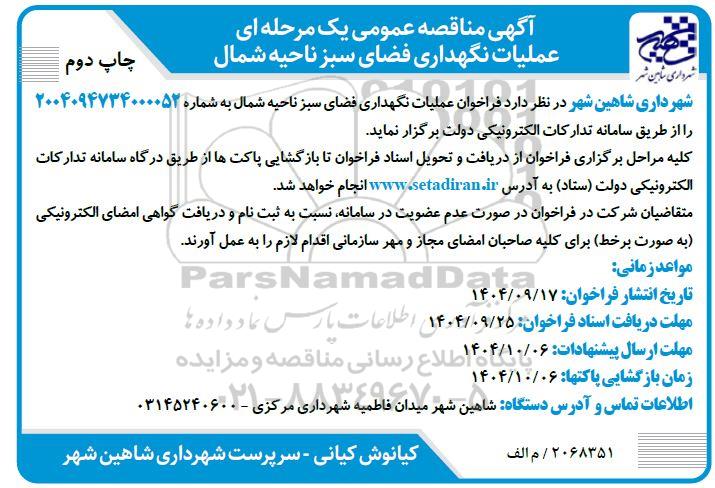 شهرداری شاهین شهر در نظر دارد فراخوان عملیات نگهداری فضای سبز ناحیه شمال به شماره 2004094734000052 را از طریق سامانه تدارکات الکترونیکی دولت برگزار نماید.