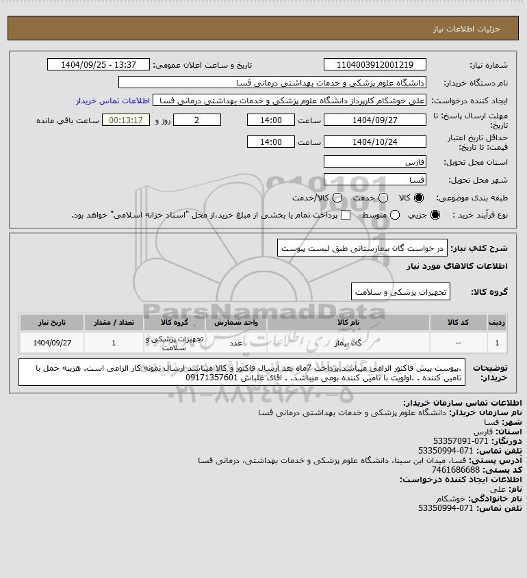 | 1 | -- | گان بیمار | عدد | تجهیزات پزشکی و سلامت | 1 | 1404/09/27 |