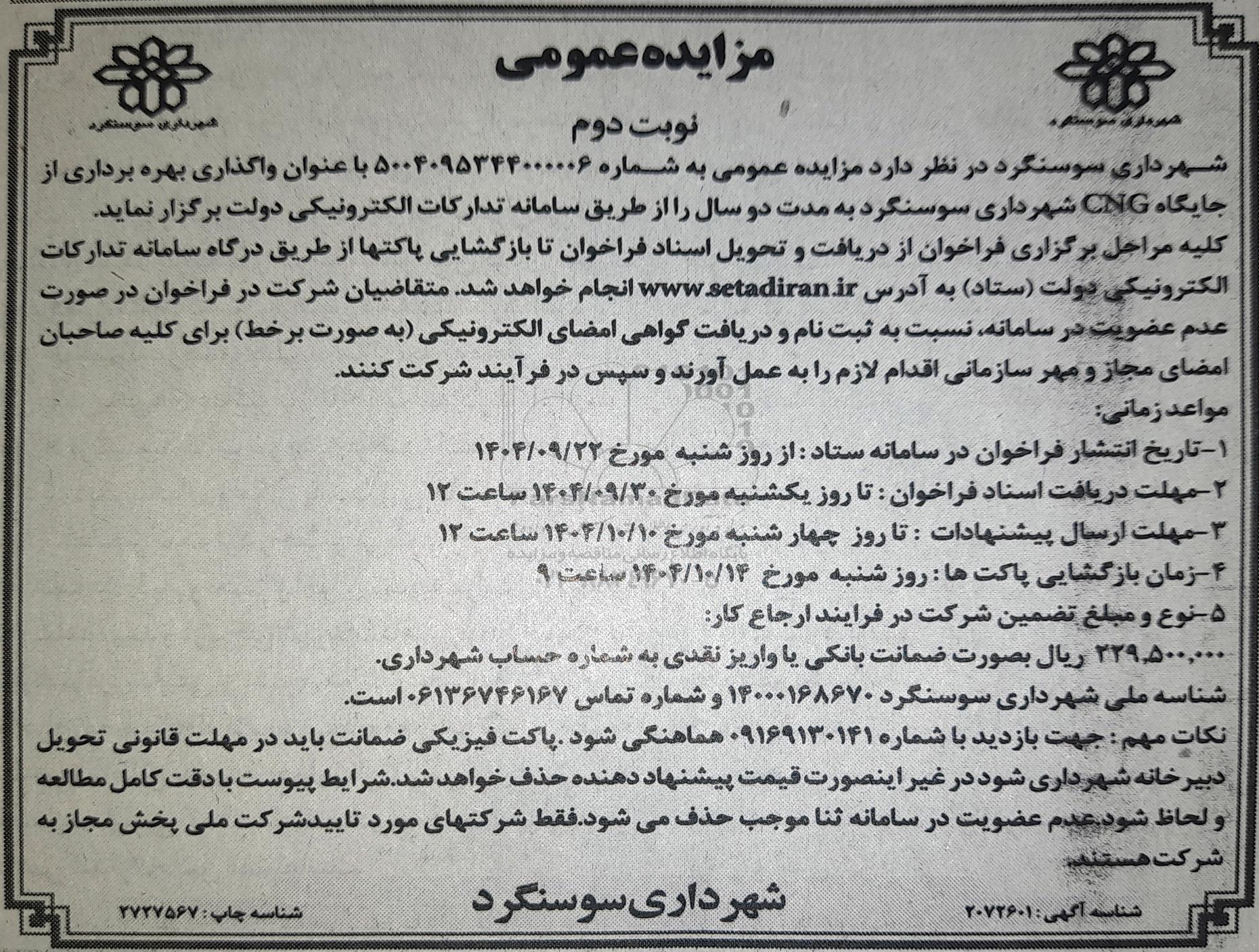 شهرداری سوسنگرد در نظر دارد مزایده عمومی به شماره 5004095344000006 با عنوان واگذاری بهره برداری از جایگاه CNG شهرداری سوسنگرد به مدت دو سال را از طریق سامانه تدارکات الکترونیکی دولت برگزار نماید.