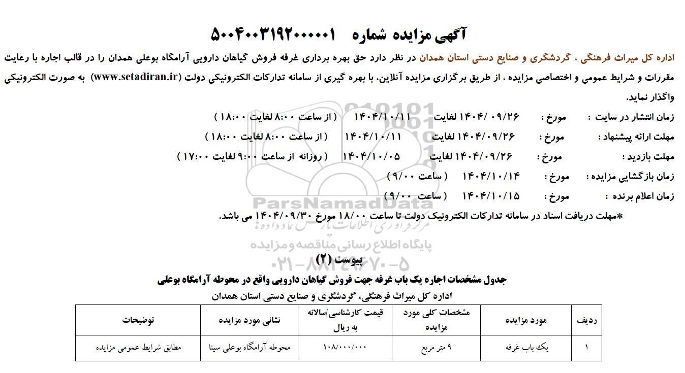 اداره کل میراث فرهنگی، گردشگری و صنایع دستی استان همدان در نظر دارد حق بهره برداری غرفه فروش گیاهان دارویی آرامگاه بوعلی همدان را در قالب اجاره با رعایت مقررات و شرایط عمومی و اختصاصی مزایده از طریق برگزاری مزایده آنلاین با بهره گیری از سامانه تدارکات الکترونیکی دولت (ستاد ایران) به صورت الکترونیکی واگذار نماید.