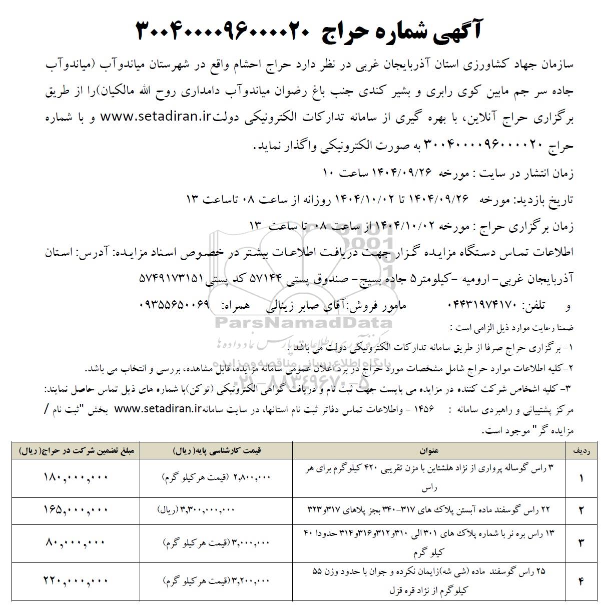 سازمان جهاد کشاورزی استان آذربایجان غربی در نظر دارد حراج احشام واقع در شهرستان میاندوآب (میاندوآب جاده جم مابین کوی رابری و بشیر کندی جنب باغ رضوان میاندوآب دامداری روح اله مالکیان را از طریق برگزاری حراج آنلاین با بهره گیری از سامانه تدارکات الکترونیکی دولت سایت ستاد ایران و با شماره حراج 3004000096000020به صورت الکترونیکی واگذار نماید.