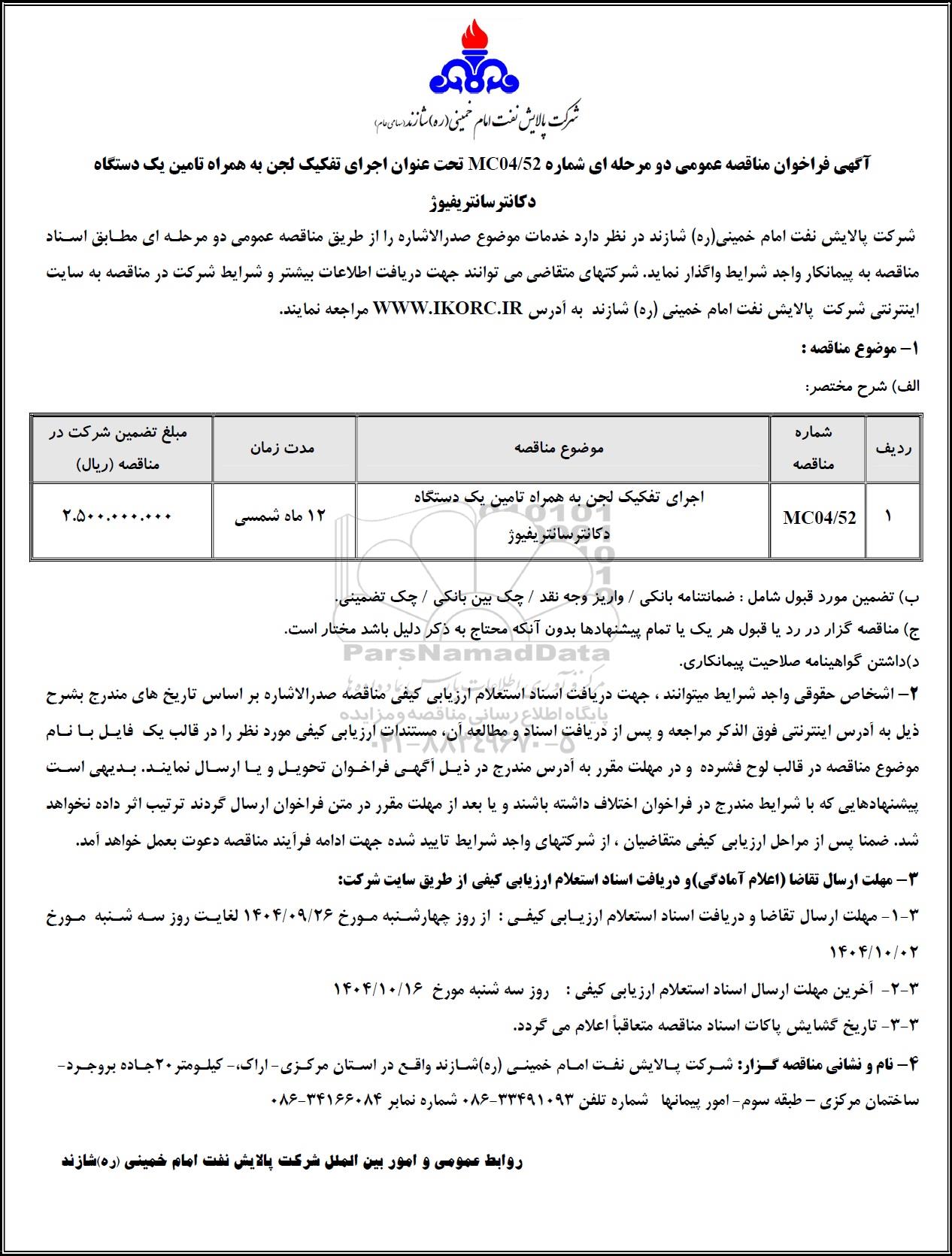 آگهی فراخوان مناقصه عمومی دو مرحله ای شماره MC04/52 تحت عنوان اجرای تفکیک لجن به همراه تامین یک دستگاه دکانترسانتریفیوژ