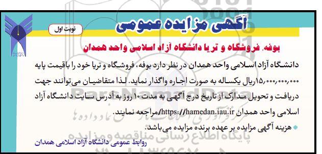 دانشگاه آزاد اسلامی واحد همدان در نظر دارد بوفه ، فروشگاه و تریا خود را با قیمت پایه 15.000.000.000 ریال یکساله به صورت اجاره واگذار نماید. لذا متقاضیان می توانند جهت دریافت و تحویل مدارک از تاریخ درج اگهی به مدت 10 روز به ادرس سایت دانشگاه آزاد اسلامی واحد همدان www.hamedan.iau.ir مراجعه نمایند