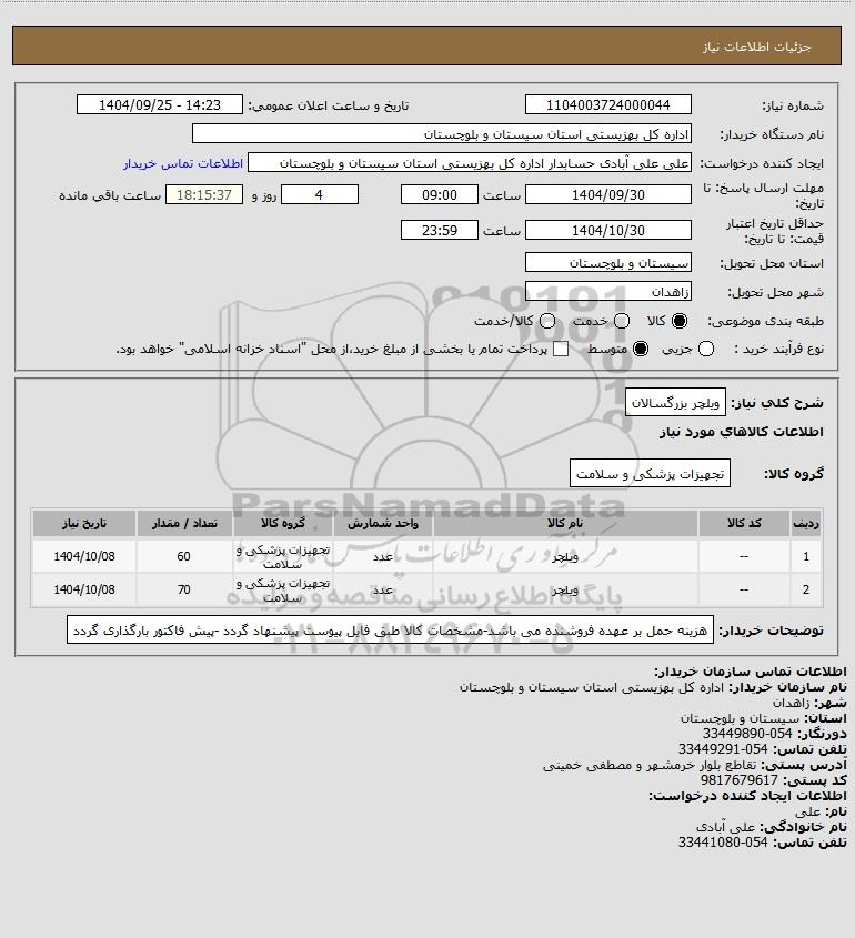 | 1 | -- | ویلچر | عدد | تجهیزات پزشکی و سلامت | 60 | 1404/10/08 |