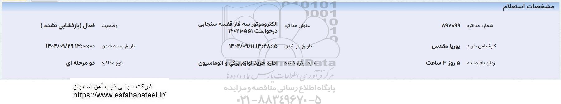 عنوان مذاکره : الکتروموتور سه فاز قفسه سنجابی درخواست 140210551