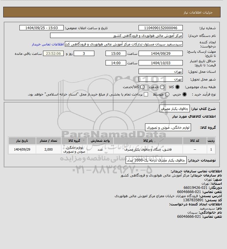 استعلام بها و موضوع استعلام استعلام چاقوی یکبار مصرف به اطلاع کلیه شرکت‌ها و افراد متخصص واجد شرایط می‌رساند، آگهی گذار در نظر دارد از طریق استعلام بها، نسبت به انتخاب و دریافت پیشنهادات اقدام نماید. این استعلام با کد آگهی ثبت شده در سامانه خبرگزاری پارس نماد : 10008765 منتشر شده است. مشخصات استعلام : تاریخ شروع استعلام: 1404/09/25 آخرین مهلت ارسال پیشنهاد قیمت : 1404/09/29 و محل اجرای پروژه : استان مناقصات استان تهران میباشد. استعلام قیمت مورد درخواست : استعلام چاقوی یکبار مصرف با دسته‌بندی‌های تخصصی و گروه های مرتبط : انواع ظروف پلاستیکی, استعلام اطلاع رسانی میگردد.