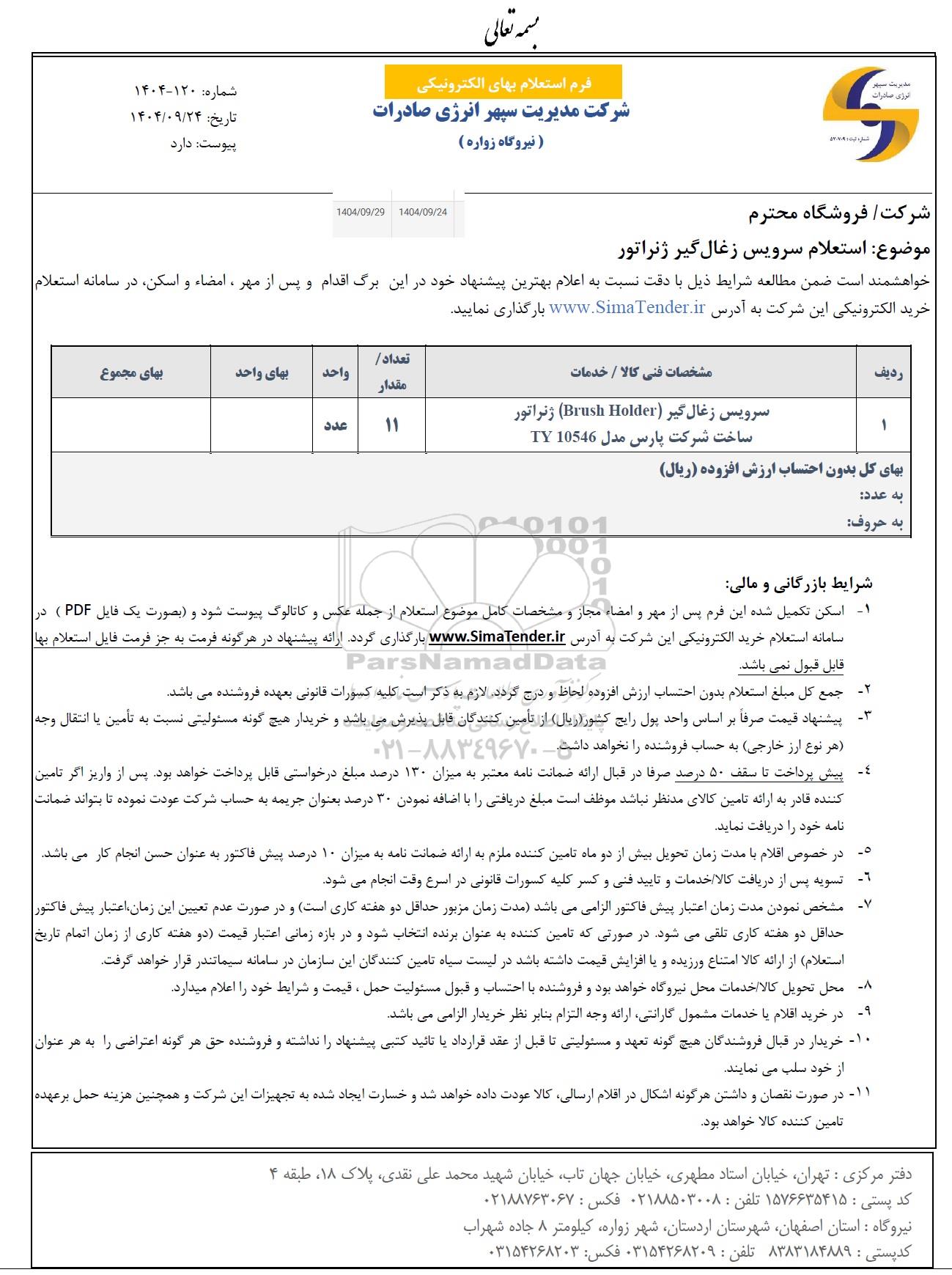 خواهشمند است ضمن مطالعه شرایط ذیل با دقت نسبت به اعلام بهترین پیشنهاد خود در این برگ اقدام و پس از مهر امضا اسکن در سامانه استعلام خرید الکترونیکی به آدرس www.SimaTender.IR بارگذاری نمایید ارایه قیمت طی پیش فاکتور به تنهایی مورد قبول نمی باشد.