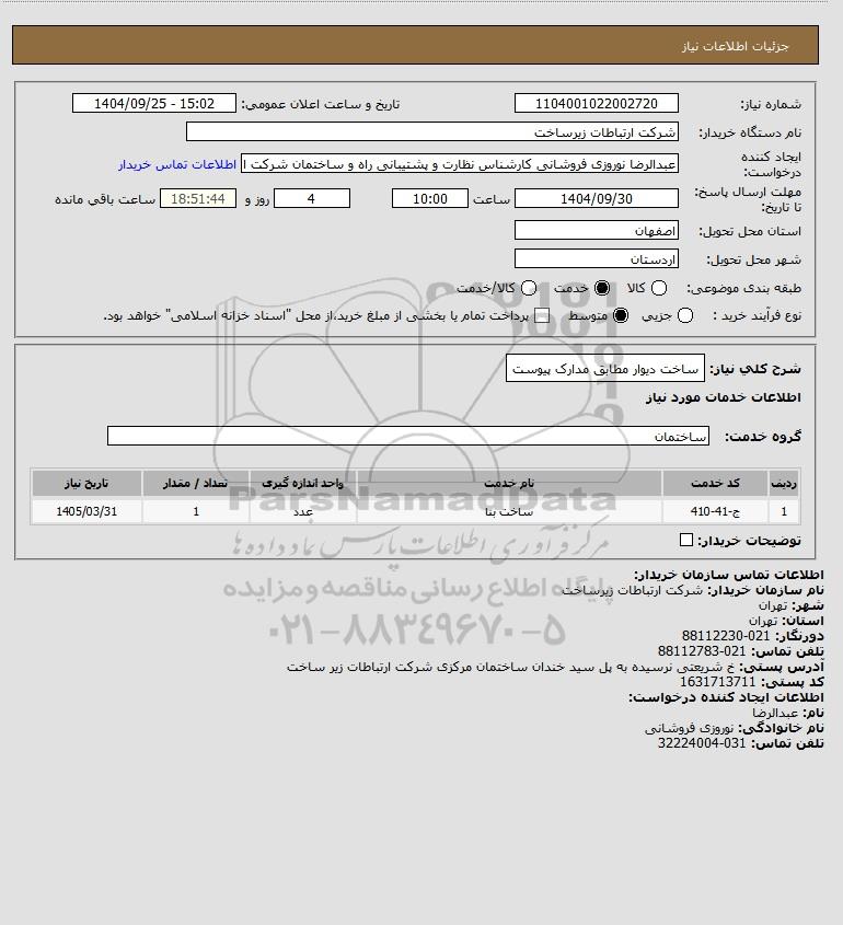 شرح کلی نیاز: ساخت دیوار مطابق مدارک پیوست