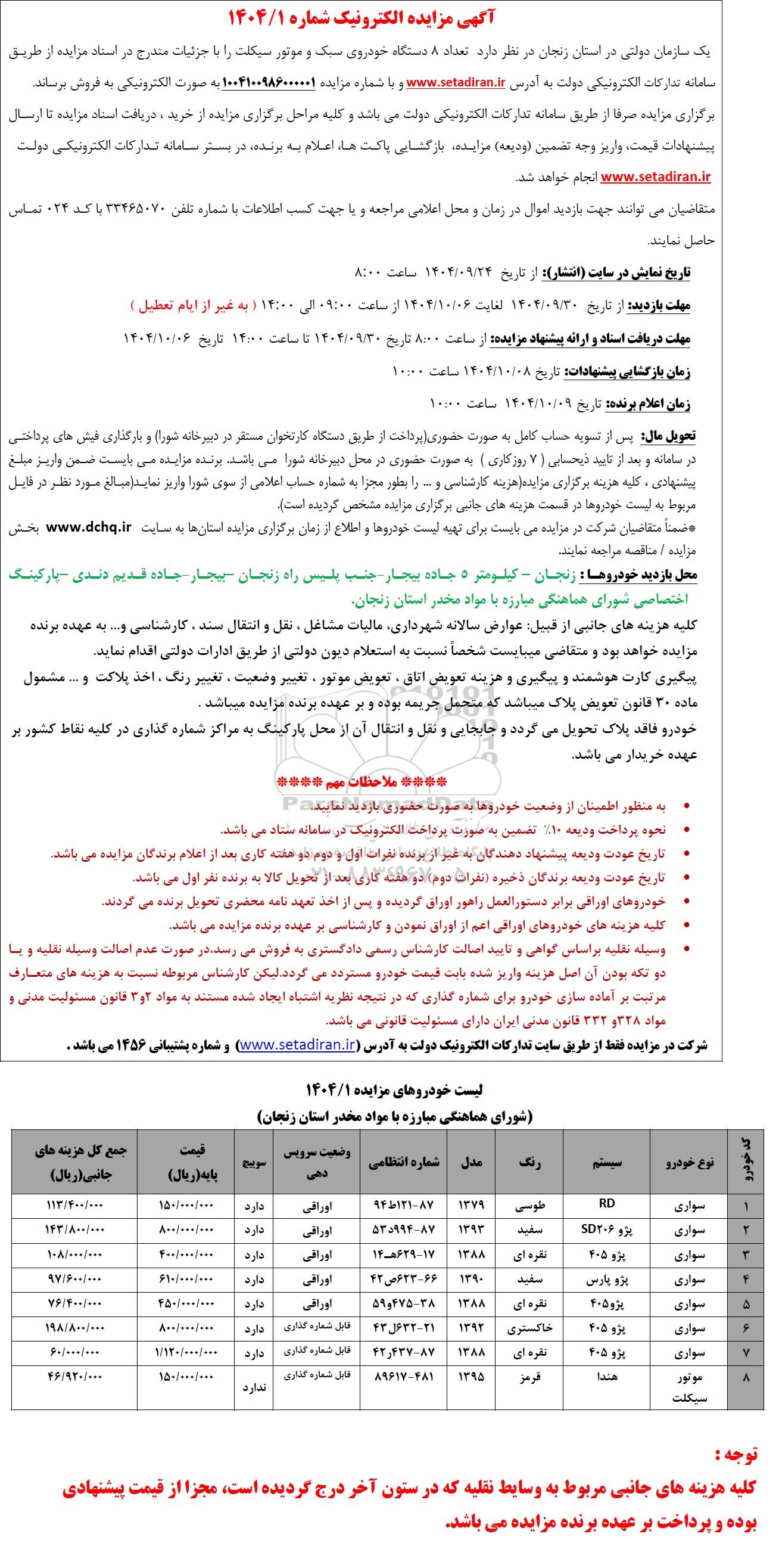 یک سازمان دولتی در استان زنجان در نظر دارد تعداد 8 دستگاه خودروی سبک و موتورسیکلت را با جزئیات مندرج در اسناد مزایده از طریق سامانه تدارکات الکترونیکی دولت و با شماره مزایده 1004100986000001 به صورت الکترونیکی به فروش برساند.