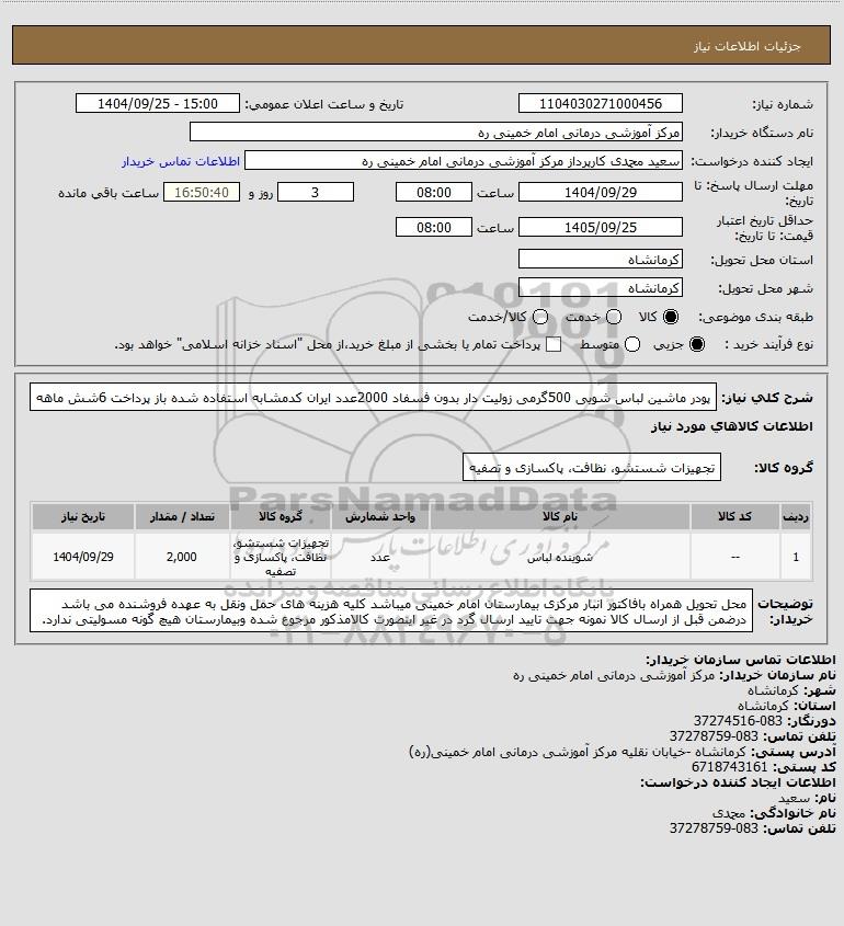 شرح کلی نیاز: پودر ماشین لباس شویی 500گرمی زولیت دار بدون فسفاد 2000عدد ایران کدمشابه استفاده شده باز پرداخت 6شش ماهه