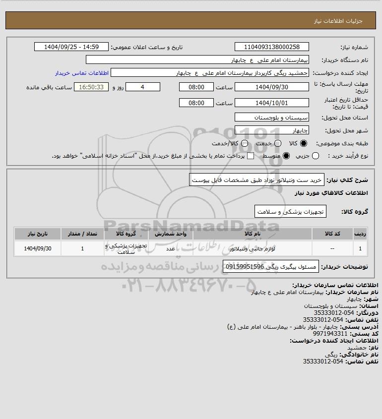 | 1 | -- | لوازم جانبی ونتیلاتور | عدد | تجهیزات پزشکی و سلامت | 1 | 1404/09/30 |