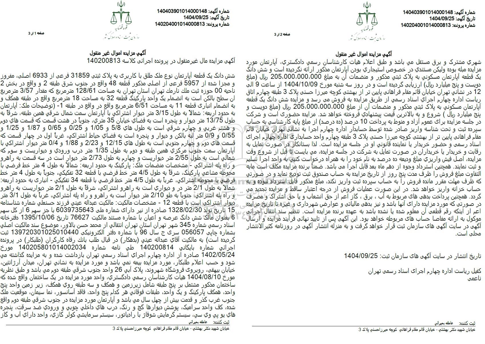 شش دانگ یک قطعه آپارتمان نوع ملک طلق با کاربری به پلاک ثبتی 31859 فرعی از 6933 اصلی مفروز و مجزا شده از 5957 فرعی از اصلی مذکور قطعه 48 واقع در جنوب شرق طبقه 2 و واقع در بخش 2 ناحیه 00 حوزه ثبت ملک نارمک تهران استان تهران به مساحت 128.61 متر مربع که مقدار 3.57 متر مربع ان سطح بالکن است به انضمام یک واحد پارکینگ قطعه 32 به مساحت 18 متر مربع واقع در طبقه همکف و به انضمام انباری قطعه 11 به مساحت 6.51 متر مربع واقع در واقع در طبقه -1 توضیحات ملک: آپارتمان به حدود اربعه شمالاً به طول 3.15 متر دیوار اشتراکی با آپارتمان سمت شمال شرقی همین طبقه، شرقاً به طول 13.75 متر دیوار و پنجره است به فضای خیابان 35 متری جنوبا در هشت قسمت که قسمت های دوم و هشتم غربی و چهارم شرقی است به طول های 5.8 و 1.05 و 0.25 و 0.65 و 1.87 و 1.25 و 0.55 و 0.9 متر لیه بالکن و دیوار و پنجره است به فضای حیاط اشتراكی غرباً اول در چهار قسمت که قسمت های دوم و چهارم جنوبی است به طول های 12.15 و 2.23 و 1.88 و 0.4 متر دیوار اشتراکی با آپارتمان سمت جنوب مرکزی همین طبقه و دوم به طول 1.35 متر درب ورودی و دیواریست و سوم که شمالی است به طول 2.55 متر دیواریست و چهارم به طول 2.73 متر دیوار است در سه قسمت به راهرو و راه پله اشتراكی - مشخصات منضمات ملک پارکینگ به حدود اربعه شمالا به طول 4 متر خط فرضی با محوطه مشاعی پارکینگ شرقاً به طول 4.5 متر خط فرضی با قطعه 32 تفكیكی جنوباً به طول 4 متر خط فرضی با محوطه اشتراكی غرباً به طول 4.5 متر خط فرضی با قطعه 34 تفكیكی - انباری به حدود اربعه شمالاً به طول 2.1 متر در و دیواری است به راهرو اشتراكی شرقاً به طول 2.1 متر دیواریست به راهرو و راه پله اشتراكی، جنوبا به طو 2.10 متر دیوار است به راهرو و راه پله اشتراکی غرباً به طول 3.1 متر دیوار اشتراکی است با قطعه 12 - مشخصات مالکیت مالكیت عبداله عینی فرزند حسنعلی شماره شناسنامه 15 تاریخ تولد 1328.02.30 صادره از نیر دارای شماره ملی 6039735643 با جز سهم 6 از کل سهم 6 بعنوان مالک شش دانگ عرصه و اعیان با شماره مستند مالکیت 76627 تاریخ 1395.10.06 دفتر خانه اسناد رسمی شماره 345 شهر تهران استان تهران انتقالی از محمد حسن بالاور موضوع سند مالكیت اصلی بشماره چاپی 056057 سری ج سال 96 با شماره دفتر الکترونیکی 139720301025010440 ثبت گردیده است به مالکیت آقای عبداله عینی (بدهکار) در قبال طلب بانک رفاه کارگران (طلبکار) در پرونده اجرانی شماره بایگانی 140200814 طی نامه شماره 140205801014002034 مورخ 1402.05.24 صادره از اداره چهارم اجرای اسناد رسمی تهران بازداشت شده و به مزایده گذاشته می شود و حسب اعلام طلبکار مورد مزایده بیمه نمی باشد و مورد مزایده به نشانی تهران، میدان آرژانتین خیابان بیهقی روبروی فروشگاه شهروند، پلاک آبی 26 واحد جنوب شرقی طبقه دوم می باشد و طبق نظریه مورخ 1404.08.10 هیات کارشناسان رسمی دادگستری واحد مورد مزایده در یک ساختمان واقع شده که ساختمان مذکور مشتمل بر پنج طبقه شامل زیر زمین و همکف و سه طبقه روی همکف زیر زمین واحد پنج واحد همکف پارکینگ و یک واحد طبقات فوقانی هر کدام پنج واحد فاقد آسانسور نما سیمان، موقعیت ملک جنوب غرب گذر و قدمت بیش از چهل سال می باشد و آپارتمان مورد مزایده در جنوب شرقی طبقه دوم واقع شده کف واحد سرامیک پوشش دیوارها گچ و رنگ دربهای داخلی چوبی و ورودی ضد سرقت پنجره های یو پی وی سی سیستم گرمایش شوفاژ با رادیاتور سیستم سرمایشی کولر گازی، واحد دارای آب و گاز شهری مشترک و برق مستقل می باشد و طبق اعلام هیات کارشناسان رسمی دادگستری، آپارتمان مورد مزایده میله بوده ولیکن مستندی در خصوص استیجاری بودن آپارتمان مذکور ارائه نگردیده است و شش دانگ یک قطعه آپارتمان مسکونی به پلاک ثبتی مذکور و منضمات آن به مبلغ 205.000.000.000 ریال (مبلغ دویست و پنج میلیارد ریال )ارزیابی گردیده است و در روز سه شنبه مورخ 1404.10.09 از ساعت 9 الی 12 در نشانی تهران خیابان قائم مقام فراهانی پایین تر از بهشتی کوچه میرزا حسنی پلاک 3 طبقه چهارم اتاق ریاست اداره چهارم اجرای اسناد رسمی از طریق مزایده به فروش میرسد و مزایده شش دان