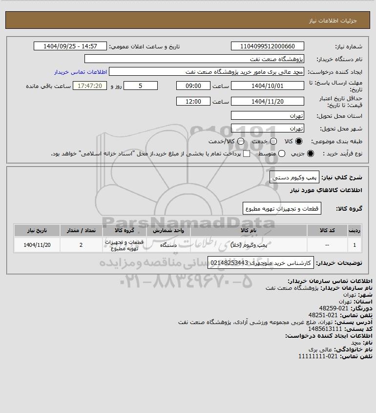 | 1 | -- | پمپ وکیوم (خلأ) | دستگاه | قطعات و تجهیزات تهویه مطبوع | 2 | 1404/11/20 |