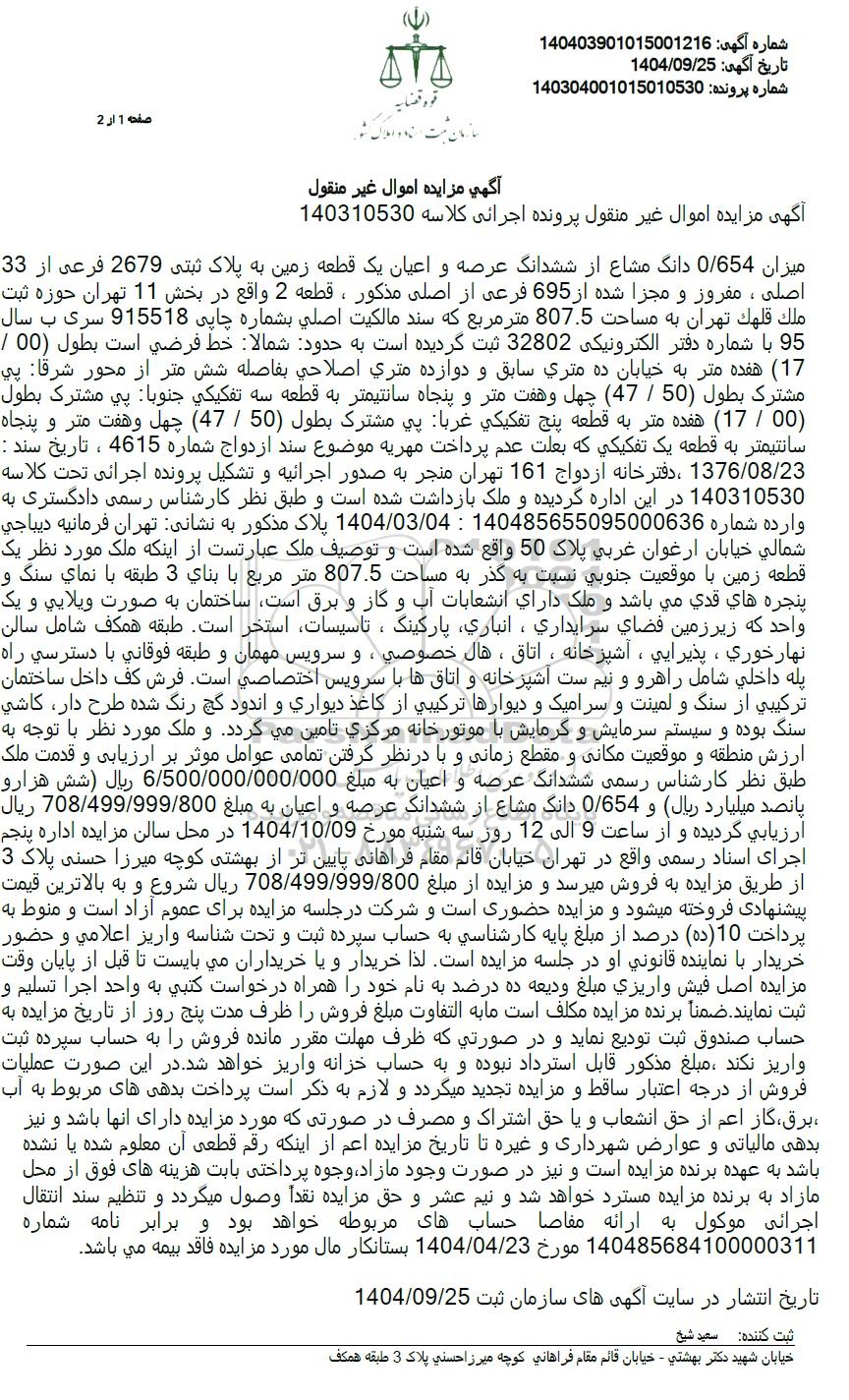 میزان 0.654 دانگ مشاع از ششدانگ عرصه و اعیان یک قطعه زمین به پلاک ثبتی 2679 فرعی از 33 اصلی ، مفروز و مجزا شده از 695 فرعی از اصلی مذکور ، قطعه 2 واقع در بخش 11 تهران حوزه ثبت ملک قلهک تهران به مساحت 807.5 متر مربع که سند مالکیت اصلی بشماره چاپی 915518 سری ب سال 95 با شماره دفتر الکترونیکی 32802 ثبت گردیده است به حدود شمالا خط فرضی است بطول 00 .(17) هفده متر به خیابان ده متری سابق و دوازده متری اصلاحی بفاصله شش متر از محور شرقا پی مشترک بطول 50 . (47) چهل و هفت متر و پنجاه سانتیمتر به قطعه سه تفکیکی جنوبا پی مشترک بطول (00 . 17) هفده متر به قطعه پنج تفکیکی غربا پی مشترک بطول (50) . (47) چهل و هفت متر و پنجاه سانتیمتر به قطعه یک تفکیکی که بعلت عدم پرداخت مهریه موضوع سند ازدواج شماره 4615 ، تاریخ سند : 1376.08.23 ، دفترخانه ازدواج 161 تهران منجر به صدور اجرائیه و تشکیل پرونده اجرائی تحت کلاسه 140310530 در این اداره گردیده و ملک بازداشت شده است و طبق نظر کارشناس رسمی دادگستری به وارده شماره 140485655095000636 : 1404.03.04 پلاک مذکور به نشانی: تهران فرمانیه دیباجی شمالی خیابان ارغوان غربی پلاک 50 واقع شده است و توصیف ملک عبارتست از اینکه ملک مورد نظر یک قطعه زمین با موقعیت جنوبی نسبت به گذر به مساحت 807.5 متر مربع با بنای 3 طبقه با نمای سنگ و پنجره های قدی می باشد و ملک دارای انشعابات آب و گاز و برق است ساختمان به صورت ویلایی و یک واحد که زیر زمین فضای سرایداری ، انباری ،پارکینگ ، تاسیسات استخر است طبقه همکف شامل سالن نهار خوری ، پذیرایی ، آشپزخانه ، اتاق ، هال خصوصی ، و سرویس مهمان و طبقه فوقانی با دسترسی راه پله داخلی شامل راهرو و نیم ست آشپزخانه و اتاقها با سرویس اختصاصی است. فرش کف داخل ساختمان ترکیبی از سنگ و لمینت و سرامیک و دیوارها ترکیبی از کاغذ دیواری و اندود گچ رنگ شده طرح دار کاشی سنگ بوده و سیستم سرمایش و گرمایش با موتورخانه مرکزی تامین می گردد و ملک مورد نظر با توجه به ارزش منطقه و موقعیت مکانی و مقطع زمانی و با در نظر گرفتن تمامی عوامل موثر بر ارزیابی و قدمت ملک طبق نظر کارشناس رسمی ششدانگ عرصه و اعیان به مبلغ 6.500.000.000.000 ریال شش هزار و ریال پانصد میلیارد ریال و 0.654 دانگ مشاع از ششدانگ عرصه و اعیان به مبلغ 708.499.999.800 . ارزیابی گردیده و از ساعت 9 الی 12 روز سه شنبه مورخ 1404.10.09 در محل سالن مزایده اداره پنجم اجرای اسناد رسمی واقع در تهران خیابان قائم مقام فراهانی پایین تر از بهشتی کوچه میرزا حسنی پلاک 3 از طریق مزایده به فروش میرسد و مزایده از مبلغ 708.499.999.800 ریال شروع و به بالاترین قیمت پیشنهادی فروخته میشود و مزایده حضوری است و شرکت در جلسه مزایده برای عموم آزاد است و منوط به پرداخت (10 (ده) درصد از مبلغ پایه کارشناسی به حساب سپرده ثبت و تحت شناسه واریز اعلامی و حضور خریدار با نماینده قانونی او در جلسه مزایده است. لذا خریدار و یا خریداران می بایست تا قبل از پایان وقت مزایده اصل فیش واریزی مبلغ ودیعه ده درصد به نام خود را همراه درخواست کتبی به واحد اجرا تسلیم و ثبت نمایند. ضمناً برنده مزایده مکلف است ما به التفاوت مبلغ فروش را ظرف مدت پنج روز از تاریخ مزایده به حساب صندوق ثبت تودیع نماید و در صورتی که ظرف مهلت مقرر مانده فروش را به حساب سپرده ثبت واریز نکند ، مبلغ مذکور قابل استرداد نبوده و به حساب خزانه واریز خواهد شد. در این صورت عملیات فروش از درجه اعتبار ساقط و مزایده تجدید میگردد و لازم به ذکر است پرداخت بدهی های مربوط به آب برق گاز اعم از حق انشعاب و یا حق اشتراک و مصرف در صورتی که مورد مزایده دارای آنها باشد و نیز بدهی مالیاتی و عوارض شهرداری و غیره تا تاریخ مزایده اعم از اینکه رقم قطعی آن معلوم شده یا نشده باشد به عهده برنده مزایده است و نیز در صورت وجود مازاد وجوه پرداختی بابت هزینه های فوق از محل مازاد به برنده مزایده مسترد خواهد شد و نیم عشر و حق مزایده نقداً وصول میگردد و تنظیم سند انتقال اجرائی موکول به ارائه مفاصا حساب های مربوطه خواهد بود و برابر نامه شمار