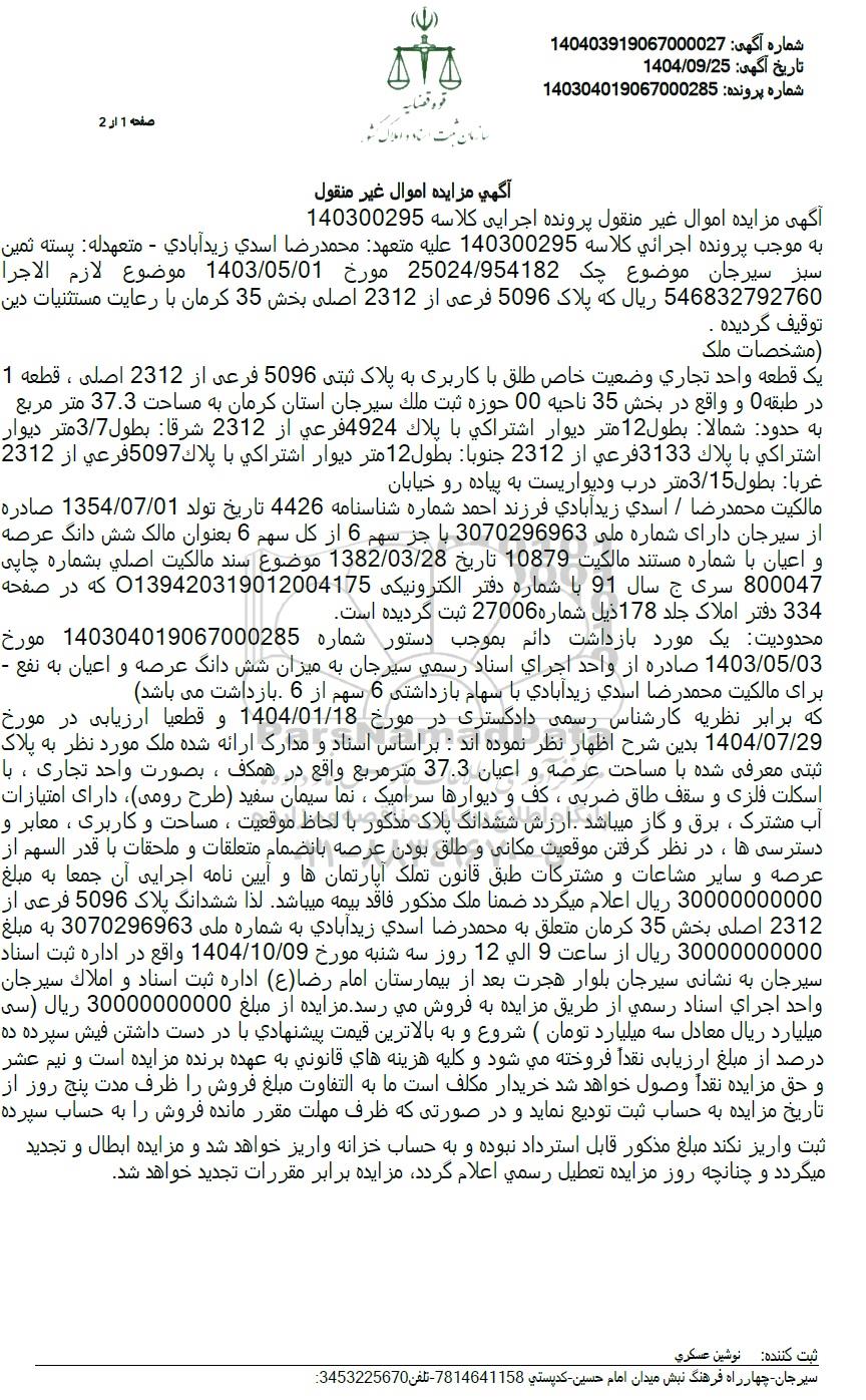 که برابر نظریه ظریه کارشناس رسمی دادگستری در مورخ 1404.01.18 و قطعیا ارزیابی در مورخ 1404.07.29 بدین شرح اظهار نظر نموده اند: بر اساس اسناد و مدارک ارائه شده ملک مورد نظر به پلاک ثبتی معرفی شده با مساحت عرصه و اعیان 37.3 متر مربع واقع در همکف ، بصورت واحد تجاری ، با اسکلت فلزی و سقف طاق ضربی ، کف و دیوارها سرامیک نما سیمان سفید طرح رومی دارای امتیازات آب مشترک ، برق و گاز میباشد ارزش ششدانگ پلاک مذکور با لحاظ موقعیت ، مساحت و کاربری ، معابر و دسترسی ها ، در نظر گرفتن موقعیت مکانی و طلق بودن عرصه بانضمام متعلقات و ملحقات با قدر السهم از عرصه و سایر مشاعات و مشترکات طبق قانون تملک آپارتمانها و آیین نامه اجرایی آن جمعا به مبلغ 30000000000 ریال اعلام میگردد ضمنا ملک مذکور فاقد بیمه میباشد. لذا ششدانگ پلاک 5096 فرعی از 2312 اصلی بخش 35 کرمان متعلق به محمدرضا اسدی زیدآبادی به شماره ملی 3070296963 به مبلغ 30000000000 ریال از ساعت 9 الی 12 روز سه شنبه مورخ 1404.10.09 واقع در اداره ثبت اسناد سیرجان به نشانی سیرجان بلوار هجرت بعد از بیمارستان امام رضا (ع) اداره ثبت اسناد و املاک سیرجان واحد اجرای اسناد رسمی از طریق مزایده به فروش می رسد. مزایده از مبلغ 30000000000 ریال (سی میلیارد ریال معادل سه میلیارد تومان ( شروع و به بالاترین قیمت پیشنهادی با در دست داشتن فیش سپرده ده درصد از مبلغ ارزیابی نقدا فروخته میشود و کلیه هزینه های قانونی به عهده برنده مزایده است و نیم عشر و حق مزایده نقداً وصول خواهد شد خریدار مکلف است ما به التفاوت مبلغ فروش را ظرف مدت پنج روز از تاریخ مزایده به حساب ثبت تودیع نماید و در صورتی که ظرف مهلت مقرر مانده فروش را به حساب سپرده