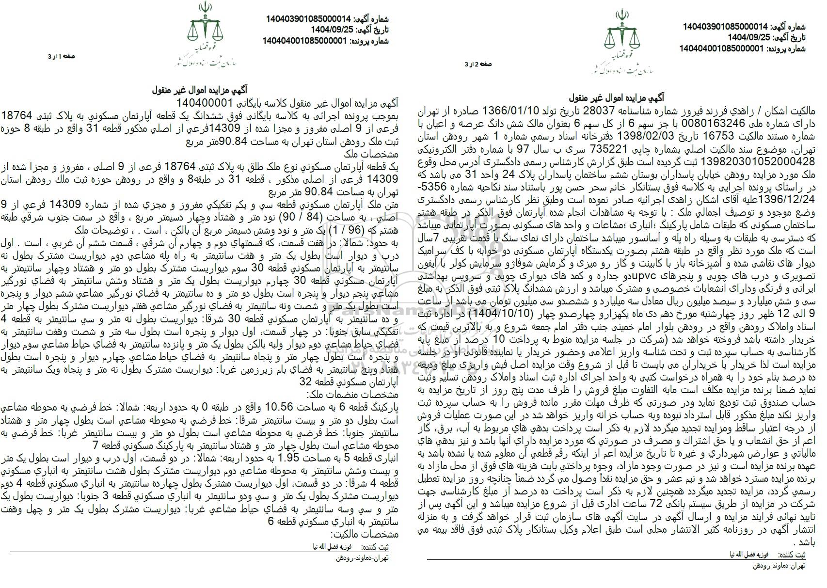 مالکیت اشکان . زاهدي فرزند فیروز شماره شناسنامه 28037 تاریخ تولد 1366.01.10 صادره از تهران دارای شماره ملی 0080163246 با جز سهم 6 از کل سهم 6 بعنوان مالک شش دانگ عرصه و اعیان با شماره مستند مالکیت 16753 تاریخ 1398.02.03 دفترخانه اسناد رسمی شماره 1 شهر رودهن استان تهران موضوع سند مالکیت اصلی بشماره چاپی 735221 سری ب سال 97 با شماره دفتر الکترونیکی 139820301052000428 ثبت گردیده است طبق گزارش کارشناس رسمی دادگستری آدرس محل وقوع ملک مورد مزایده رودهن خیابان پاسداران بوستان ششم ساختمان پاسداران پلاک 24 واحد 31 می باشد که در راستای پرونده اجرایی به کلاسه فوق بستانکار خانم سحر حسن پور باستناد سند نکاحیه شماره 5356 1396.12.24 علیه آقای اشکان زاهدی اجرائیه صادر نموده است و طبق نظر کارشناس رسمی دادگستری وضع موجود و توصیف اجمالی ملک : با توجه به مشاهدات انجام شده آپارتمان فوق الذکر در طبقه هشتم ساختمان مسکونی که طبقات شامل پارکینگ انباری ؛ مشاعات و واحدهای مسکونی بصورت آپارتمانی میباشد که دسترسی به طبقات به وسیله راه پله و آسانسور میباشد ساختمان دارای نمای سنگ با قدمت تقریبی 7 سال است که ملک مورد نظر واقع در طبقه هشتم بصورت یکدستگاه آپارتمان مسکونی دو خوابه با کف سرامیک دیوارهای نقاشی شده و آشپزخانه باز با کابینت و گاز رو میزی و گرمایش شوفاژ و سرمایش کولر با آیفون تصویری و دربهای چوبی و پنجرهای upvc دو جداره و کمدهای دیواری چوبی و سرویس بهداشتی ایرانی و فرنگی و دارای انشعابات خصوصی و مشترک میباشد و ارزش ششدانگ پلاک ثبتی فوق الذكر به مبلغ سی و شش میلیارد و سیصد میلیون ریال معادل سه میلیارد و ششصد و سی میلیون تومان می باشد از ساعت 9 الى 12 ظهر روز چهارشنبه مورخ دهم دی ماه یکهزار و چهار صد و چهار (1404.10.10) در اداره ثبت اسناد و املاک رودهن واقع در رودهن بلوار امام خمینی جنب دفتر امام جمعه شروع و به بالاترین قیمت که خریدار داشته باشد فروخته خواهد شد شرکت در جلسه مزایده منوط به پرداخت 10 درصد از مبلغ پایه کارشناسی به حساب سپرده ثبت و تحت شناسه واریز اعلامی و حضور خریدار یا نماینده قانونی او در جلسه مزایده است لذا خریدار یا خریداران می بایست تا قبل از شروع وقت مزایده اصل فیش واریزی مبلغ ودیعه ده درصد بنام خود را به همراه درخواست کتبی به واحد اجرای اداره ثبت اسناد و املاک رودهن تسلیم و ثبت نماید ضمنا برنده مزایده مکلف است ما به التفاوت مبلغ فروش را ظرف مدت پنج روز از تاریخ مزایده به حساب صندوق ثبت تودیع نماید و در صورتی که ظرف مهلت مقرر مانده فروش را به حساب سپرده ثبت واریز نکند مبلغ مذکور قابل استرداد نبوده و به حساب خزانه واریز خواهد شد در این صورت عملیات فروش از درجه اعتبار ساقط و مزایده تجدید میگردد لازم به ذکر است پرداخت بدهي هاي مربوط به آب برق گاز اعم از حق انشعاب و یا حق اشتراك و مصرف در صورتي که مورد مزایده داراي آنها باشد و نیز بدهي هاي مالياتي و عوارض شهرداری و غیره تا تاریخ مزایده اعم از اینکه رقم قطعي ان معلوم شده یا نشده باشد به عهده برنده مزایده است و نیز در صورت وجود مازاد وجوه پرداختي بابت هزينه هاي فوق از محل مازاد به برنده مزایده مسترد خواهد شد و نیم عشر و حق مزایده نقداً وصول ميگردد ضمناً چنانچه روز مزایده تعطیل رسمي گردد مزایده تجدید میگردد همچنین لازم به ذکر است پرداخت ده درصد از مبلغ کارشناسی جهت شرکت در مزایده از طریق سیستم بانکی 72 ساعت اداری قبل از شروع مزایده میباشد و این آگهی پس از تایید نهایی فرایند مزایده و ارسال آگهی در سایت آگهی های سازمان ثبت قرار خواهد گرفت و به منزله انتشار آگهی در روزنامه کثیر الانتشار محلی است طبق اعلام وکیل بستانکار پلاک ثبتی فوق فاقد بيمه مي باشد
