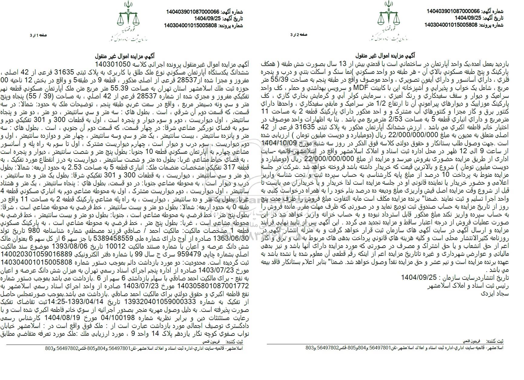 آگهی مزایده اموال غیر منقول پرونده اجرائی کلاسه 140301050 ششدانگ یکدستگاه آپارتمان مسکونی نوع ملک طلق با کاربری به پلاک ثبتی 31635 فرعی از 42 اصلی ، مفروز و مجزا شده از 28537 فرعی از اصلی مذکور، قطعه 9 در طبقه 5 و واقع در بخش 12 ناحیه 00 حوزه ثبت ملک اسلامشهر استان تهران به مساحت 55.39 متر مربع متن ملک آپارتمان مسکونی قطعه نهم تفکیکی مفرور و مجزی شده از شماره 28537 فرعی از 42 اصلی ، به مساحت (39) . 55) پنجاه وپنج متر و سی و نه دسیمتر مربع، واقع در سمت غربی طبقه پنجم، توضیحات ملک به حدود شمالا در سه قسمت که قسمت دوم ان شرقی ، است . بطول های : سه متر و سی سانتیمتر، دو متر ، دو متر و پنجاه سانتیمتر، اول دیواریست، دوم و سوم دیوار و پنجره است ، اول به قطعات 300 و 301 تفکیکی دوم و سوم به فضای نورگیر مشاعی شرقا در چهار قسمت که قسمت دوم آن جنوبی ، است . بطول های : سه متر و پانزده سانتیمتر ، بیست سانتیمتر، یک متر و سی و سه سانتیمتر، چهار متر و دوازده سانتیمتر ، اول و دوم دیواریست ، سوم درب و دیوار است. چهارم دیواریست مشترک ، اول تا سوم به راه پله و آسانسور مشاعی چهارم به آپارتمان مسکونی قطعه 10 جنوبا بطول پنج متر و شصت سانتیمتر ، دیوار و پنجره است. به فضای حیاط مشاعی غربا بطول ده متر و شصت سانتیمتر، دیواریست به درز انقطاع مورد تفکیک ، به قطعه 317 تفکیکی مشخصات منضمات ملک انباری قطعه 5 به مساحت 2.53 به حدود اربعه شمالا بطول دو متر و سی سانتیمتر، دیواریست، به قطعات 300 و 301 تفکیکی شرقا بطول یک متر و ده سانتیمتر . درب و دیوار است. به محوطه مشاعی جنوبا در دو قسمت بطول های پنجاه سانتیمتر ، یک متر و هشتاد سانتیمتر، اول دیواریست دوم دیواریست مشترک، اول به محوطه مشاعی دوم به انباری مسکونی قطعه 4 غربا بطول یک متر و ده سانتیمتر ، دیواریست، به راه پله مشاعی پارکینگ قطعه 2 به مساحت 11 واقع در طبقه 0 به حدود اربعه شمالا بطول دو متر و بیست سانتیمتر ، خط فرضی به محوطه مشاعی است ، شرقا بطول پنج متر ، خط فرضی به محوطه مشاعی است ، جنوبا بطول دو متر و بیست سانتیمتر ، خط فرضی به محوطه مشاعی است، غربا بطول پنج متر ، خط فرضی به محوطه مشاعی است. به پارکینگ مسکونی قطعه 1 مشخصات مالکیت مالکیت احمد . صادقی فرزند مصطفی شماره شناسنامه 980 تاریخ تولد 1363.06.30 صادره از اوج دارای شماره ملی 5389458559 با جز سهم 6 از کل سهم 6 بعنوان مالک شش دانگ عرصه و اعیان با شماره مستند مالکیت 10012 تاریخ 1393.08.06 موضوع سند مالکیت اصلی بشماره چاپی 959479 سری ج سال 99 با شماره دفتر الکترونیکی 140020301059016889 ثبت گردیده است. محدودیت دو مورد بازداشت دانم بموجب دستور شماره 140304001015005808 مورخ 1403.07.23 صادره از اداره پنجم اجرای اسناد رسمی تهران به میزان شش دانگ عرصه و اعیان به نفع - برای مالکیت احمد صادقی با سهام بازداشتی 6 سهم از 6 بازداشت میباشد بموجب دستور شماره 140305801087001772 مورخ 1403.07.23 صادره از واحد اجرای اسناد رسمی اسلامشهر به تفع فاطمه اکبری و حقوق دولتی برای مالکیت احمد صادقی بازداشت می باشد. بموجب صورتمجلس حاصل از تفکیک به شماره 139320401059000333 تاریخ 1393.04.14-14:25 ثبت تقاضای تفکیک صورت پذیرفته است. به دلیل وصول مهریه منجر بصدور اجرائیه از سوی خانم فاطمه اکبری شده است و با رعایت مستثنثات دین و برابر نظریه شماره 04.100198 مورخ 1404.08.19 کارشناس رسمی دادگستری توصیف اجمالی مورد بازداشت عبارت است از: ملک فوق واقع است در اسلامشهر خیابان نواب صفوی کوچه نکار یازدهم پلاک 14 واحد 9 ، مورد ارزیابی ملک ملک مورد تعرفه متقاضی مطابق بازدید بعمل آمده یک واحد آپارتمان در ساختمانی است با قدمتی بیش از 13 سال بصورت شش طبقه ( همکف پارکینگ و پنج طبقه مسکونی بالای آن - هر طبقه دو واحد مسکونی ( نما سنگ و اسکلت بتنی و درب و پنجره فلزی ، دارای آسانسور و دارای آیفون تصویری ، واحد موصوف واقع در طبقه پنجم به مساحت 55.39 متر مربع ، شامل یک خواب و پذیرایی و آشپزخانه این با کابینت MDF و سرویس بهداشتی و حمام ، کف واحد سرامیک و دیوار و سقف سفیدکاری و رنگ آمیزی ، سرمایش کولر آبی و گرمایش ب