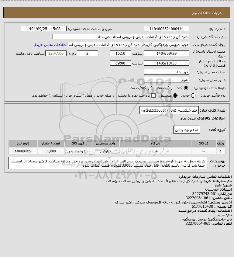شرح کلی نیاز: قند شکسته کارتن ((33000کیلوگرم)