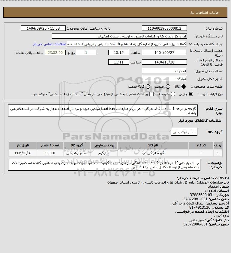 شرح کلی نیاز: گوجه نو درجه 1 سبدی فاقد هرگونه خرابی و ضایعات. فقط اعضا میادین میوه و تره بار اصفهان مجاز به شرکت در استعلام می باشند
