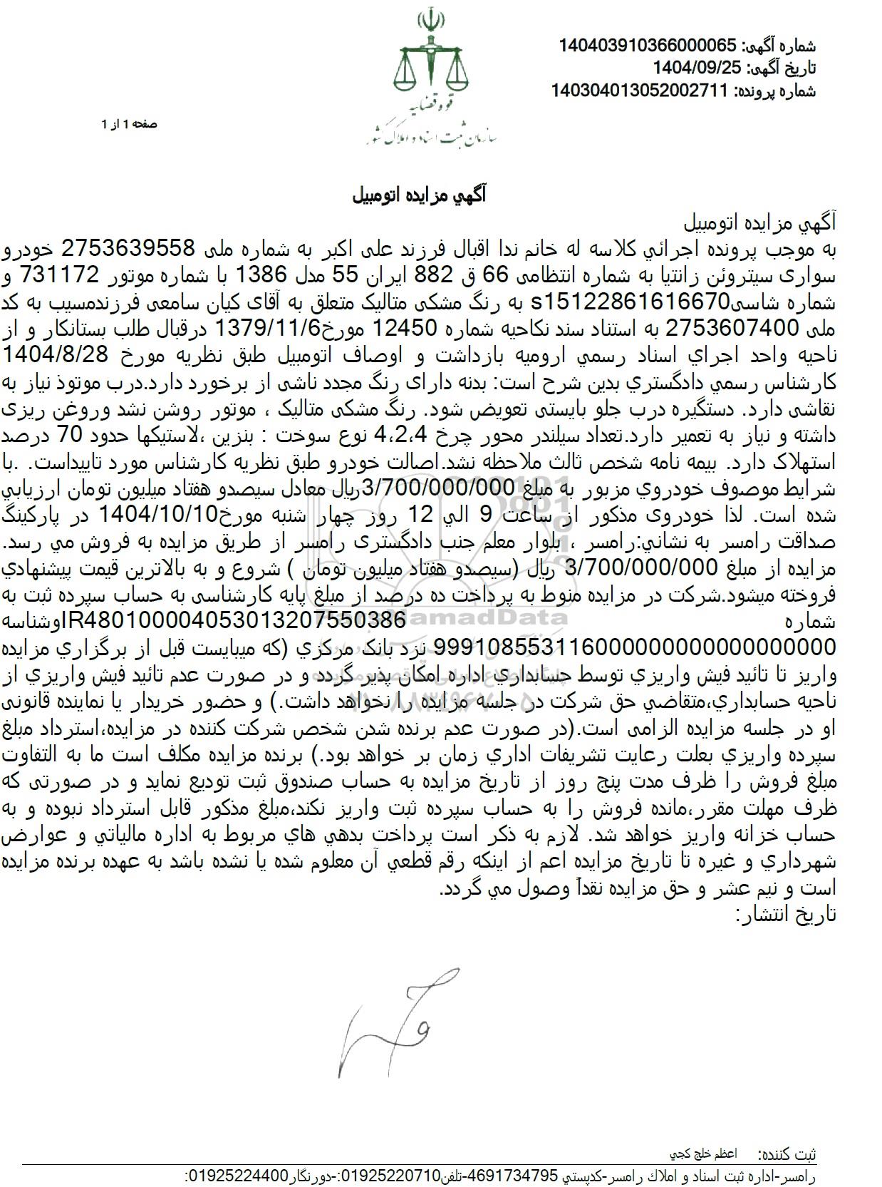 به موجب پرونده اجرائی کلاسه له خانم ندا اقبال فرزند علی اکبر به شماره ملی 2753639558 خودرو سواری سیتروئن زانتیا به شماره انتظامی 66 ق 882 ایران 55 مدل 1386 با شماره موتور 731172 و شماره شاسی s15122861616670 به رنگ مشکی متالیک متعلق به آقای کیان سامعی فرزند مسیب به کد ملی 2753607400 به استناد سند نکاحیه شماره 12450 مورخ 1379.11.6 در قبال طلب بستانکار و از ناحیه واحد اجرای اسناد رسمی ارومیه بازداشت و اوصاف اتومبیل طبق نظریه مورخ 1404.8.28 کارشناس رسمی دادگستری بدین شرح است بدنه دارای رنگ مجدد ناشی از برخورد دارد. درب موتود نیاز به نقاشی دارد دستگیره درب جلو بایستی تعویض شود. رنگ مشکی متالیک ، موتور روشن نشد و روغن ریزی داشته و نیاز به تعمیر دارد. تعداد سیلندر محور چرخ 4،2،4 نوع سوخت : بنزین ، لاستیکها حدود 70 درصد استهلاک دارد بیمه نامه شخص ثالث ملاحظه نشد. اصالت خودرو طبق نظریه کارشناس مورد تایید است. با شرایط موصوف خودروی مزبور به مبلغ 3.700.000.000 ریال معادل سیصد و هفتاد میلیون تومان ارزیابی شده است. لذا خودروی مذکور از ساعت 9 الی 12 روز چهار شنبه مورخ 1404.10.10 در پارکینگ صداقت رامسر به نشانی: رامسر ، بلوار معلم جنب دادگستری رامسر از طریق مزایده به فروش می رسد. مزایده از مبلغ 3.700.000.000 ریال ( سیصد و هفتاد میلیون تومان ( شروع و به بالاترین قیمت پیشنهادی فروخته میشود. شرکت در مزایده منوط به پرداخت ده درصد از مبلغ پایه کارشناسی به حساب سپرده ثبت به شماره و شناسه R480100004053013207550386