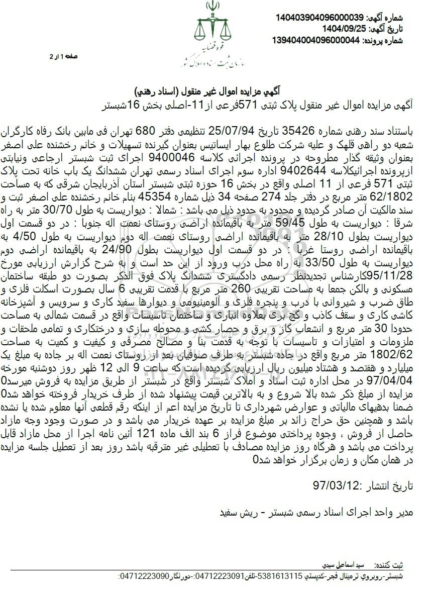 آگهی مزایده اموال غیر منقول پلاک ثبتی 571 فرعی از 1-1 - اصلی بخش 16 شبستر