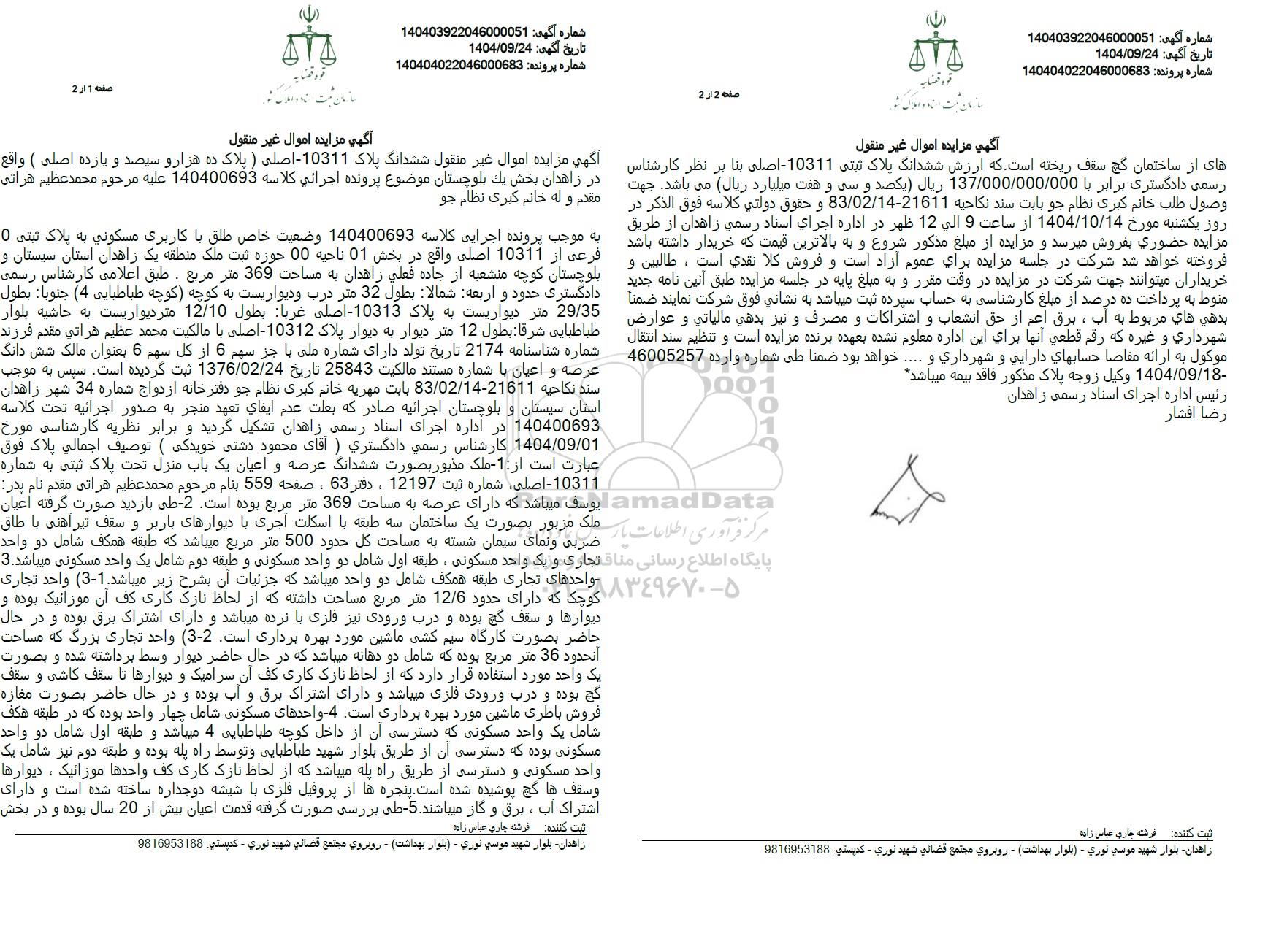 به موجب پرونده اجرایی کلاسه 140400693 وضعیت خاص طلق با کاربری مسکونی به پلاک ثبتی 0 فرعی از 10311 اصلی واقع در بخش 01 ناحیه 00 حوزه ثبت ملک منطقه یک زاهدان استان سیستان و بلوچستان کوچه منشعبه از جاده فعلی زاهدان به مساحت 369 متر مربع . طبق اعلامی کارشناس رسمی دادگستری حدود و اربعه شمالا بطول 32 متر درب و دیواریست به کوچه کوچه طباطبایی (4) جنوبا بطول 29.35 متر دیواریست به پلاک 10313 - اصلی غربا بطول 12.10 متر دیواریست به حاشیه بلوار طباطبایی شرقا بطول 12 متر دیوار به دیوار پلاک 10312 - اصلی با مالکیت محمد عظیم هراتي مقدم فرزند شماره شناسنامه 2174 تاریخ تولد دارای شماره ملی با جز سهم 6 از کل سهم 6 بعنوان مالک شش دانگ عرصه و اعیان با شماره مستند مالکیت 25843 تاريخ 1376.02.24 ثبت گردیده است. سپس به موجب سند نکاحيه 21611-83.02.14 بابت مهریه خانم کبری نظام جو دفترخانه ازدواج شماره 34 شهر زاهدان استان سیستان و بلوچستان اجرائیه صادر که بعلت عدم ايفاي تعهد منجر به صدور اجرائيه تحت کلاسه 140400693 در اداره اجرای اسناد رسمی زاهدان تشکیل گردید و برابر نظریه کارشناسی مورخ 1404.09.01 کارشناس رسمی دادگستری ) آقای محمود دشتی خویدکی ( توصیف اجمالی پلاک فوق عبارت است از : 1- ملک مذبور بصورت ششدانگ عرصه و اعیان یک باب منزل تحت پلاک ثبتی به شماره 10311 - اصلی، شماره ثبت 12197 : دفتر 63 ، صفحه 559 بنام مرحوم محمد عظیم هراتی مقدم نام پدر یوسف میباشد که دارای عرصه به مساحت 369 متر مربع بوده است. 2- طی بازدید صورت گرفته اعیان ملک مزبور بصورت یک ساختمان سه طبقه با اسکلت اجری با دیوارهای باربر و سقف تیرآهنی با طاق ضربی و نمای سیمان شسته به مساحت کل حدود 500 متر مربع میباشد که طبقه همکف شامل دو واحد تجاری و یک واحد مسکونی، طبقه اول شامل دو واحد مسکونی و طبقه دوم شامل یک واحد مسکونی میباشد. 3 واحدهای تجاری طبقه همکف شامل دو واحد میباشد که جزئیات آن بشرح زیر میباشد. 1-3 واحد تجاری کوچک که دارای حدود 12.6 متر مربع مساحت داشته که از لحاظ نازک کاری کف آن موزائیک بوده و دیوارها و سقف گچ بوده و درب ورودی نیز فلزی با نرده میباشد و دارای اشتراک برق بوده و در حال حاضر بصورت کارگاه سیم کشی ماشین مورد بهره برداری است. (2-3) واحد تجاری بزرگ که مساحت انحدود 36 متر مربع بوده که شامل دو دهانه میباشد که در حال حاضر دیوار وسط برداشته شده و بصورت یک واحد مورد استفاده قرار دارد که از لحاظ نازک کاری کف آن سرامیک و دیوارها تا سقف کاشی و سقف گچ بوده و درب ورودی فلزی میباشد و دارای اشتراک برق و آب بوده و در حال حاضر بصورت مغازه فروش باطری ماشین مورد بهره برداری است. -4 واحدهای مسکونی شامل چهار واحد بوده که در طبقه هکف شامل یک واحد مسکونی که دسترسی آن از داخل کوچه طباطبایی 4 میباشد و طبقه اول شامل دو واحد مسکونی بوده که دسترسی آن از طریق بلوار شهید طباطبایی و توسط راه پله بوده و طبقه دوم نیز شامل یک واحد مسکونی و دسترسی از طریق راه پله میباشد که از لحاظ نازک کاری کف واحدها موزائیک ، دیوارها و سقف ها گچ پوشیده شده است. پنجره ها از پروفیل فلزی با شیشه دو جداره ساخته شده است و دارای اشتراک آب ، برق و گاز میباشند. 5- طی بررسی صورت گرفته قدمت اعیان بیش از 20 سال بوده و در بخش های از ساختمان گچ سقف ریخته است که ارزش ششدانگ پلاک ثبتی 10311 - اصلی بنا بر نظر کارشناس رسمی دادگستری برابر با 137.000.000.000 ريال (یکصد و سی و هفت میلیارد ریال می باشد. جهت وصول طلب خانم کبری نظام جو بابت سند نکاحيه 21611-83.02.14 و حقوق دولتي کلاسه فوق الذکر در روز یکشنبه مورخ 1404.10.14 از ساعت 9 الی 12 ظهر در اداره اجرای اسناد رسمي زاهدان از طریق مزایده حضوری بفروش میرسد و مزایده از مبلغ مذکور شروع و به بالاترین قیمت که خریدار داشته باشد فروخته خواهد شد شرکت در جلسه مزایده برای عموم آزاد است و فروش کلا نقدی است ، طالبين و خریداران میتوانند جهت شرکت در مزایده در وقت مقرر و به مبلغ پایه در جلسه مزایده طبق آئین نامه جدید منوط به پرداخت ده درصد از مبلغ کارشناسی به حساب سپرده ثبت میب