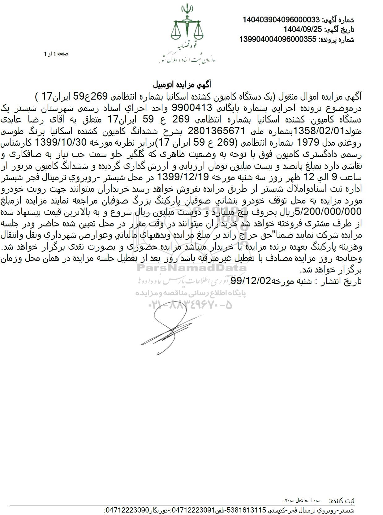 در موضوع پرونده اجرایی بشماره بایگانی 9900413 واحد اجرای اسناد رسمی شهرستان شبستر یک دستگاه کامیون کشنده اسکانیا بشماره انتظامی 269 ع 59 ایران 17 متعلق به آقای رضا عابدی متولد 1358.02.01 بشماره ملی 2801365671 بشرح ششدانگ کامیون کشنده اسکانیا برنگ طوسی روغنی مدل 1979 بشماره انتظامی (269) ع 59 ایران (17) برابر نظریه مورخه 1399.10.30 کارشناس رسمی دادگستری کامیون فوق با توجه به وضعیت ظاهری که گلگیر جلو سمت چپ نیاز به صافکاری و نقاشی دارد بمبلغ پانصد و بیست میلیون تومان ارزیابی و ارزش گذاری گردیده و ششدانگ کامیون مزبور از ساعت 9 الی 12 ظهر روز سه شنبه مورخه 1399.12.19 در محل شبستر روبروی ترمینال فجر شبستر اداره ثبت اسناد و املاك شبستر از طریق مزایده بفروش خواهد رسید خریداران میتوانند جهت رویت خودرو مورد مزایده به محل توقف خودرو بنشانی صوفیان پارکینگ بزرگ صوفیان مراجعه نمایند مزایده از مبلغ 5.200.000.000 ریال بحروف پنج میلیارد و دویست میلیون ریال شروع و به بالاترین قیمت پیشنهاد شده از طرف مشتری فروخته خواهد شد خریداران میتوانند در وقت مقرر در محل تعیین شده حاضر و در جلسه مزایده شرکت نمایند ضمنا حق حراج زاند بر مبلغ مزایده و بدهیهای مالیاتی وعوارض شهرداری ونقل وانتقال و هزینه پارکینگ بعهده برنده مزایده یا خریدار میباشد مزایده حضوری و بصورت نقدی برگزار خواهد شد. و چنانچه روز مزایده مصادف با تعطیل غیر مترقبه باشد روز بعد از تعطیل جلسه مزایده در همان محل و زمان برگزار خواهد شد.