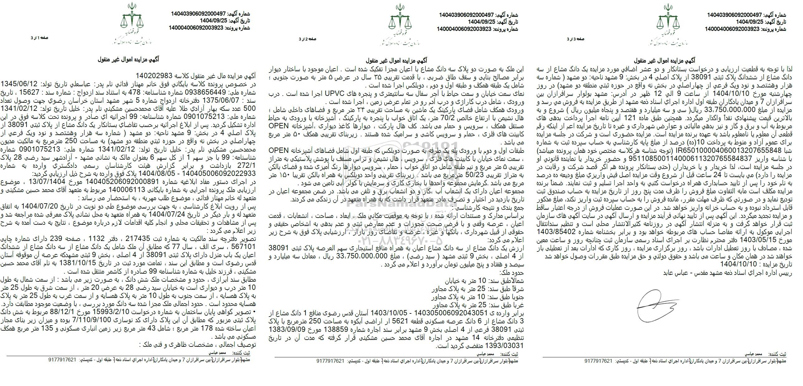 آگهی مزایده مال غیر منقول کلاسه 140202983