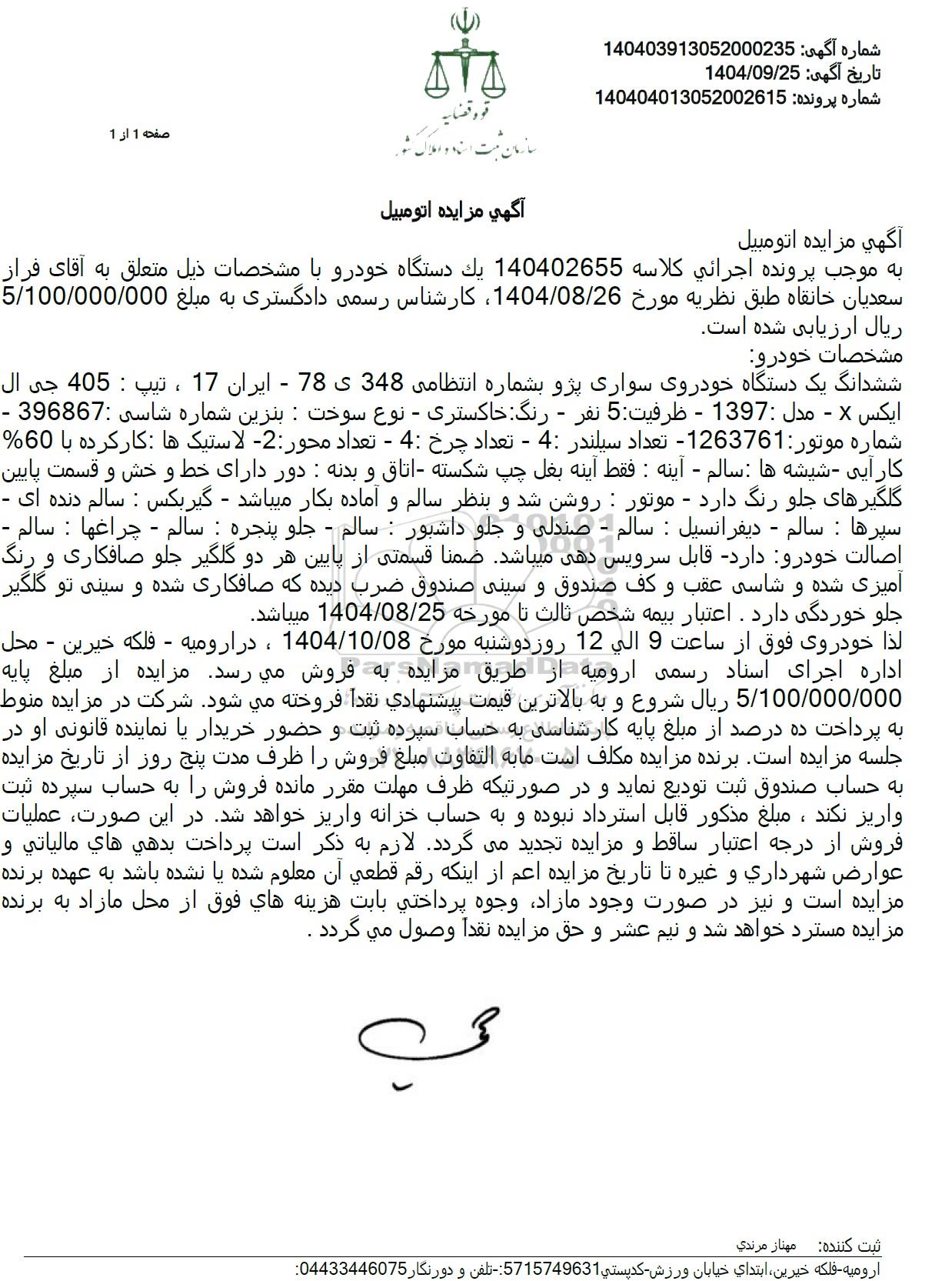 به موجب پرونده اجرائی کلاسه 140402655 يک دستگاه خودرو با مشخصات ذیل متعلق به آقای فراز سعدیان خانقاه طبق نظریه مورخ 1404.08.26، کارشناس رسمی دادگستری به مبلغ 5.100.000.000