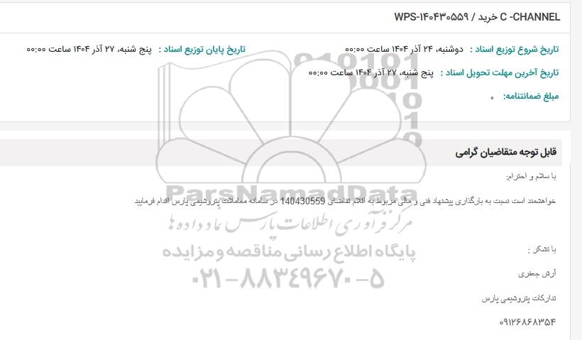 خواهشمند است نسبت به بارگذاری پیشنهاد فنی و مالی مربوط به اقلام تقاضای 140430559 در سامانه معاملات پتروشیمی پارس اقدام فرمایید