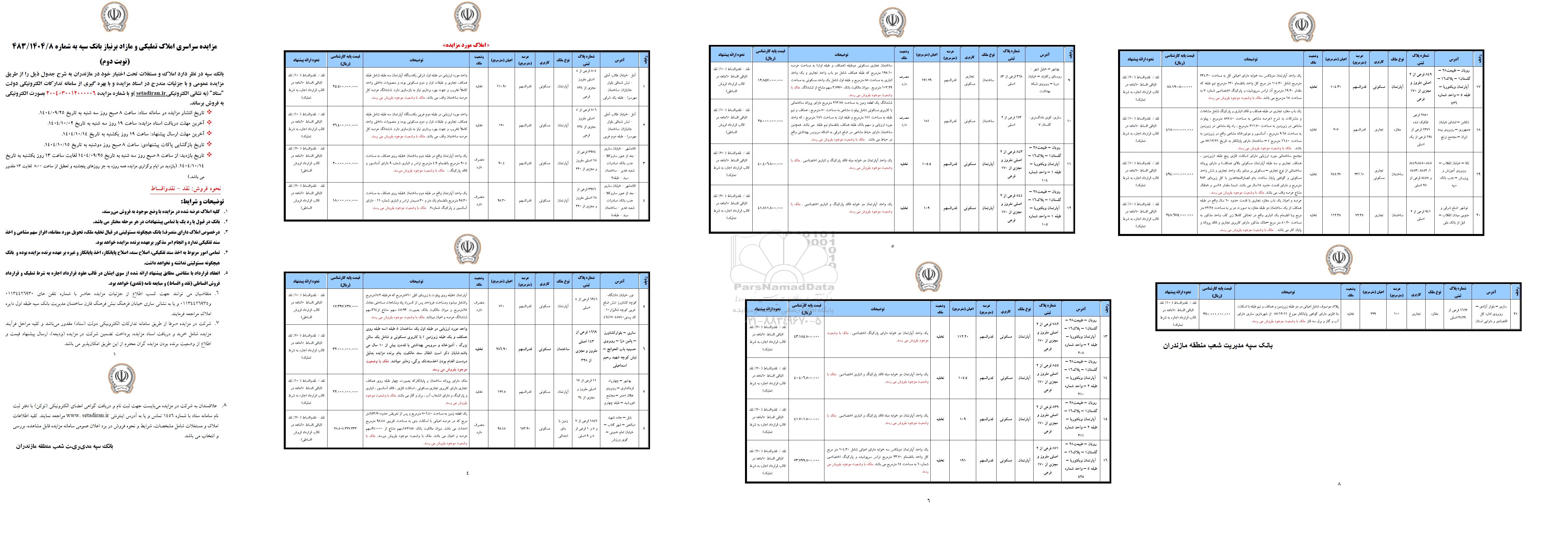 بانک سپه در نظر دارد املاک و مستغلات تحت اختیار خود در مازندران به شرح جدول ذیل را از طریق مزایده عمومی و با جزئیات مندرج در اسناد مزایده و با بهره گیری از سامانه تدارکات الکترونیکی دولت "ستاد ایران و با شماره مزایده 2004030012000006 بصورت الکترونیکی به فروش برساند.