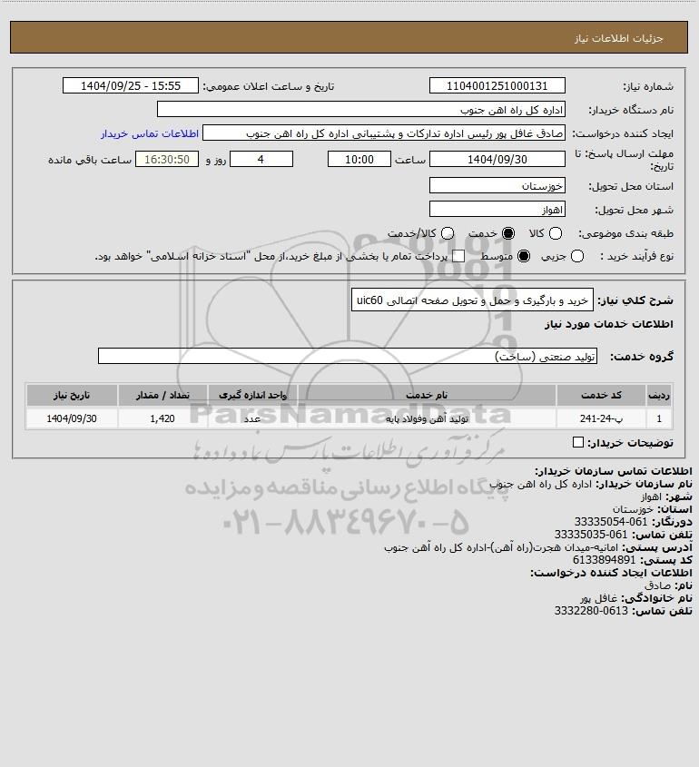 شرح کلی نیاز: خرید و بارگیری و حمل و تحویل صفحه اتصالی uic60
