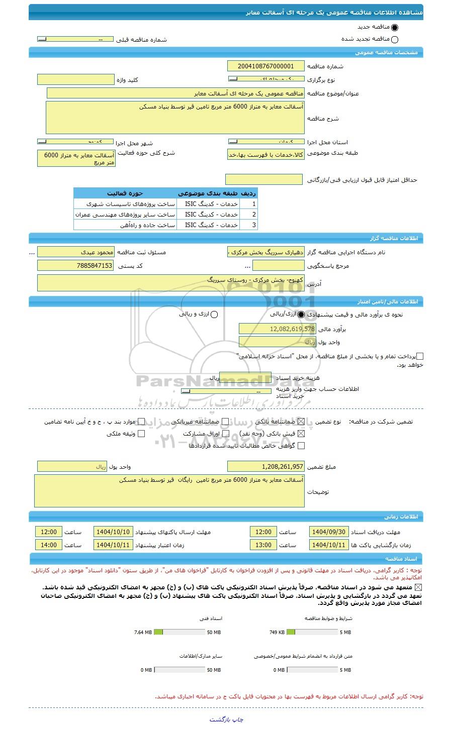 | شرح مناقصه | آسقالت معابر به متراز 6000 متر مربع تامین قیر توسط بنیاد مسکن | ||||||||||||||