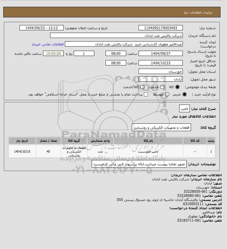 | 1 | -- | لامپ فلورسنت | عدد | قطعات و تجهیزات الکتریکی و روشنایی | 40 | 1404/10/15 |