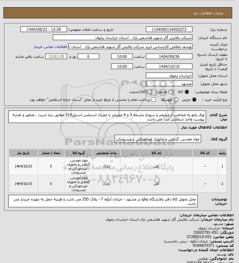 شرح کلی نیاز: ورق پانچ به ضخامت 2 میلیمتر و سوراخ چشمه 3 و 4 میلیمتر با متریال استنلس استیل316 مطابق دیتا شیت ، تصاویر و تقشه پیوست واحد شمارش عدد می باشد