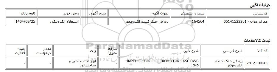 | مهران دیوان - 05141522301 | 164564 | پره فن خنک کننده الکتروموتور | استعلام الکترونیکی | 1404/09/25 |