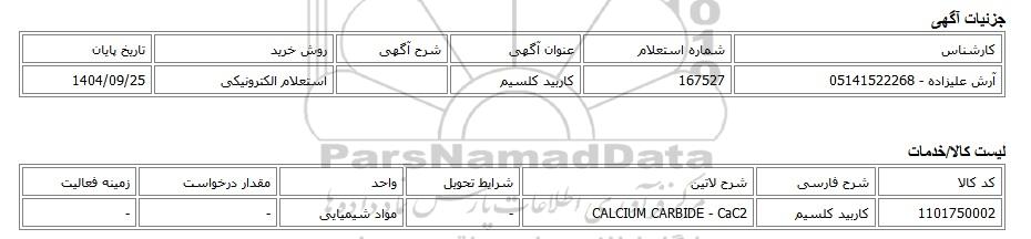 | آرش علیزاده - 05141522268 | 167527 | کاربید کلسیم | استعلام الکترونیکی | 1404/09/25 |