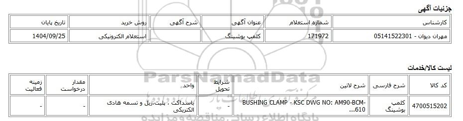 | مهران دیوان - 05141522301 | 171972 | کلمپ بوشینگ | استعلام الکترونیکی | 1404/09/25 |