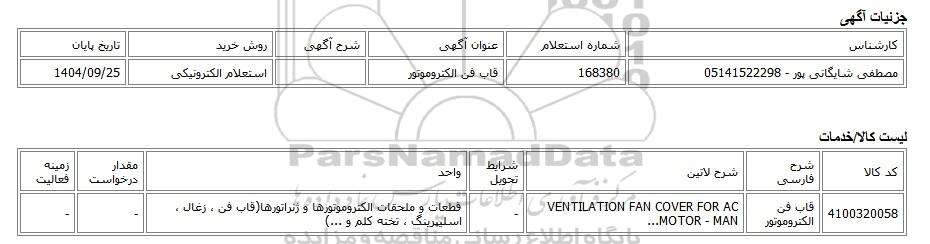 | مصطفی شایگانی پور - 05141522298 | 168380 | قاب فن الکتروموتور | استعلام الکترونیکی | 1404/09/25 |