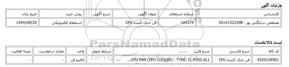 | مصطفی شایگانی پور - 05141522298 | 164274 | فن خنک کننده CPU | استعلام الکترونیکی | 1404/09/25 |