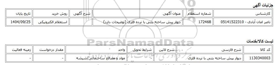 | ناصر امان آبادی - 05141522310 | 172468 | دیوار پیش ساخته بتنی با نرده فلزی (توضیحات دارد) | استعلام الکترونیکی | 1404/09/25 |