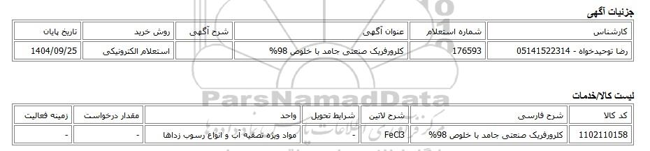 | رضا توحیدخواه - 05141522314 | 176593 | کلرورفریک صنعتی جامد با خلوص 98% | استعلام الکترونیکی | 1404/09/25 |