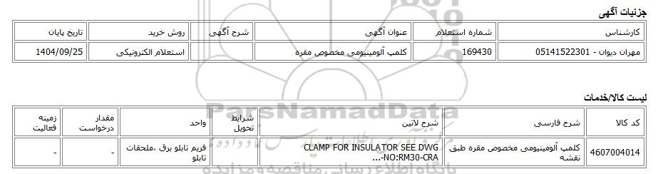 | مهران دیوان - 05141522301 | 169430 | کلمپ آلومینیومی مخصوص مقره | استعلام الکترونیکی | 1404/09/25 |