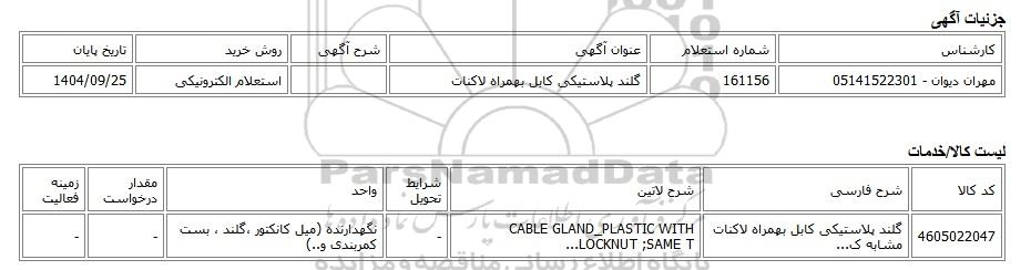 | مهران دیوان - 05141522301 | 161156 | گلند پلاستیکی کابل بهمراه لاکنات | استعلام الکترونیکی | 1404/09/25 |