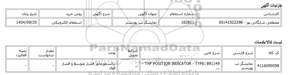 | مصطفی شایگانی پور - 05141522298 | 163811 | نمایشگر تب پوزیشنر | استعلام الکترونیکی | 1404/09/25 |