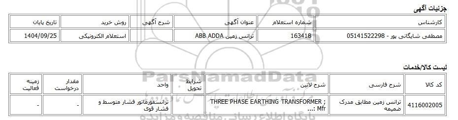 | مصطفی شایگانی پور - 05141522298 | 163418 | ترانس زمین ABB ADDA | استعلام الکترونیکی | 1404/09/25 |