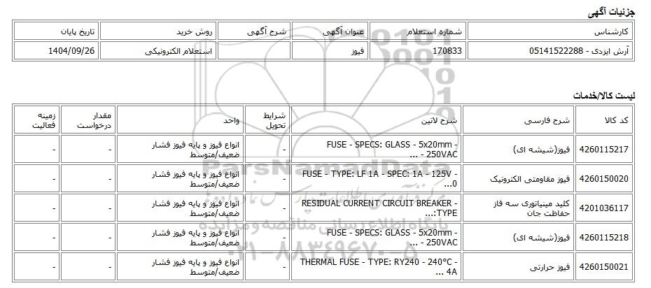 | آرش ایزدی - 05141522288 | 170833 | فیوز | استعلام الکترونیکی | 1404/09/26 |