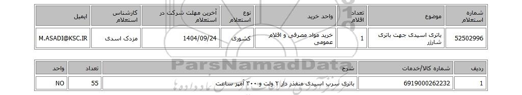 | 52502996 | باتری اسیدی جهت باتری شارژر | 1 | خرید مواد مصرفی و اقلام عمومی | کشوری | 1404/09/24 | مزدک اسدی | M.ASADI@KSC.IR |