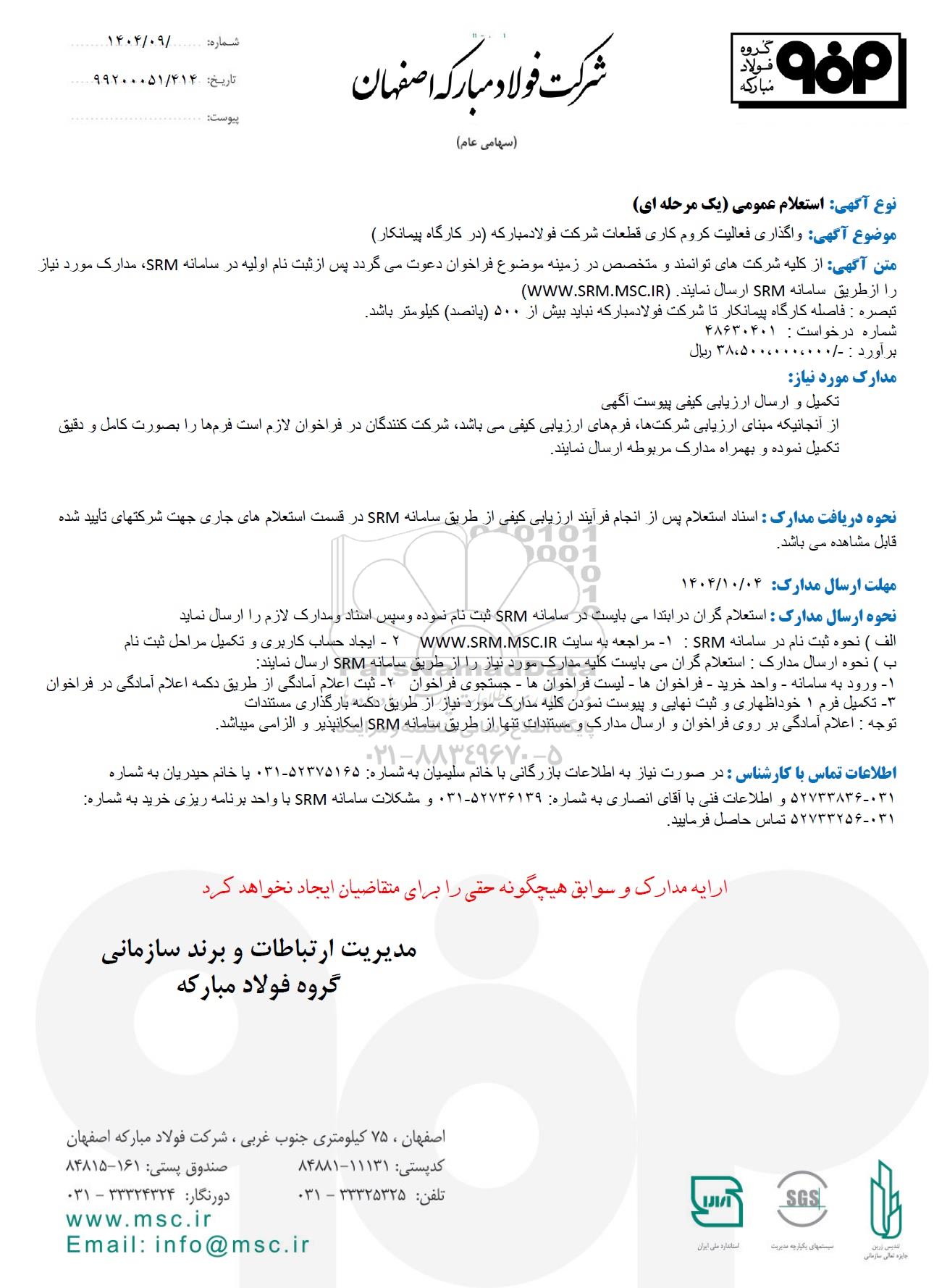 موضوع آگهی: واگذاری فعالیت کروم کاری قطعات شرکت فولاد مبارکه (در کارگاه پیمانکار)
